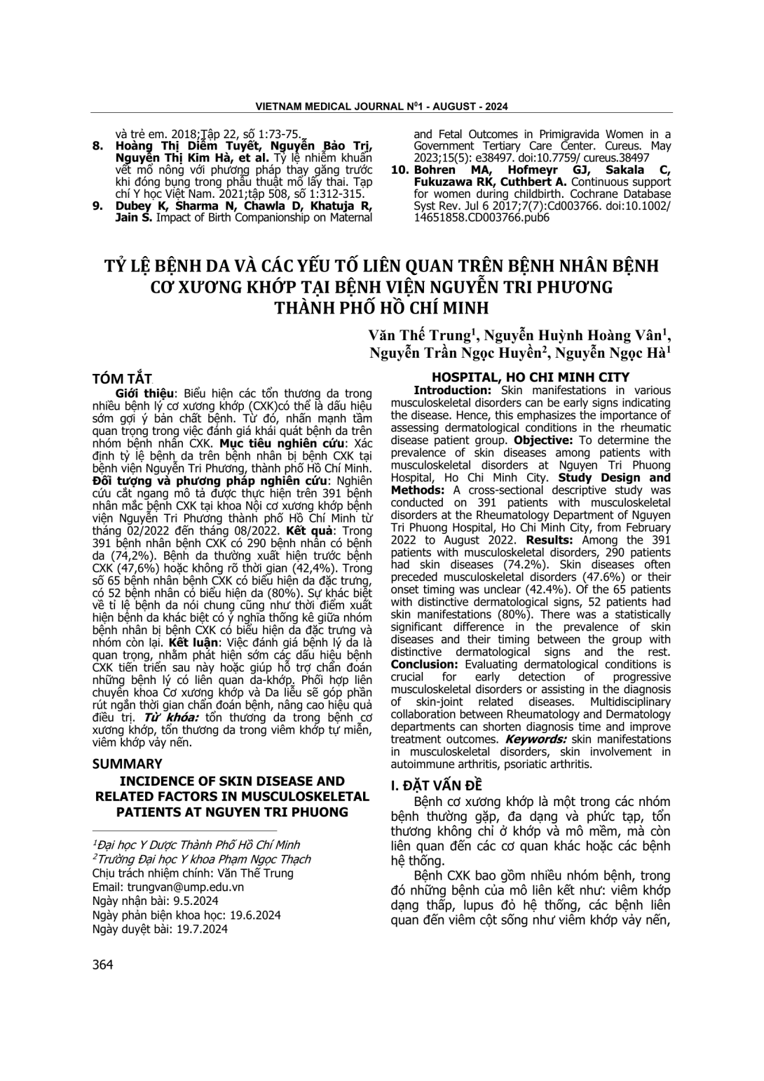 Xác định tỷ lệ bệnh da trên bệnh nhân bị bệnh CXK tại bệnh viện Nguyễn Tri Phương, thành phố Hồ Chí Minh. Đối tượng và phương pháp nghiên cứu: Nghiên cứu cắt ngang mô tả được thực hiện trên 391 bệnh nhân mắc bệnh CXK tại khoa Nội cơ xương khớp bệnh viện Nguyễn Tri Phương thành phố Hồ Chí Minh từ tháng 02/2022 đến tháng 08/2022. Kết quả: Trong 391 bệnh nhân bệnh CXK có 290 bệnh nhân có bệnh da (74,2%). Bệnh da thường xuất hiện trước bệnh CXK (47,6%) hoặc không rõ thời gian (42,4%). Trong số 65 bệnh nhân bệnh CXK có biểu hiện da đặc trưng, có 52 bệnh nhân có biểu hiện da (80%). Sự khác biệt về tỉ lệ bệnh da nói chung cũng như thời điểm xuất hiện bệnh da khác biệt có ý nghĩa thống kê giữa nhóm bệnh nhân bị bệnh CXK có biểu hiện da đặc trưng và nhóm còn lại. Kết luận: Việc đánh giá bệnh lý da là quan trọng, nhằm phát hiện sớm các dấu hiệu bệnh CXK tiến triển sau này hoặc giúp hỗ trợ chẩn đoán những bệnh lý có liên quan da-khớp. Phối hợp liên chuyên khoa Cơ xương khớp và Da liễu sẽ góp phần rút ngắn thời gian chẩn đoán bệnh, nâng cao hiệu quả điều trị.