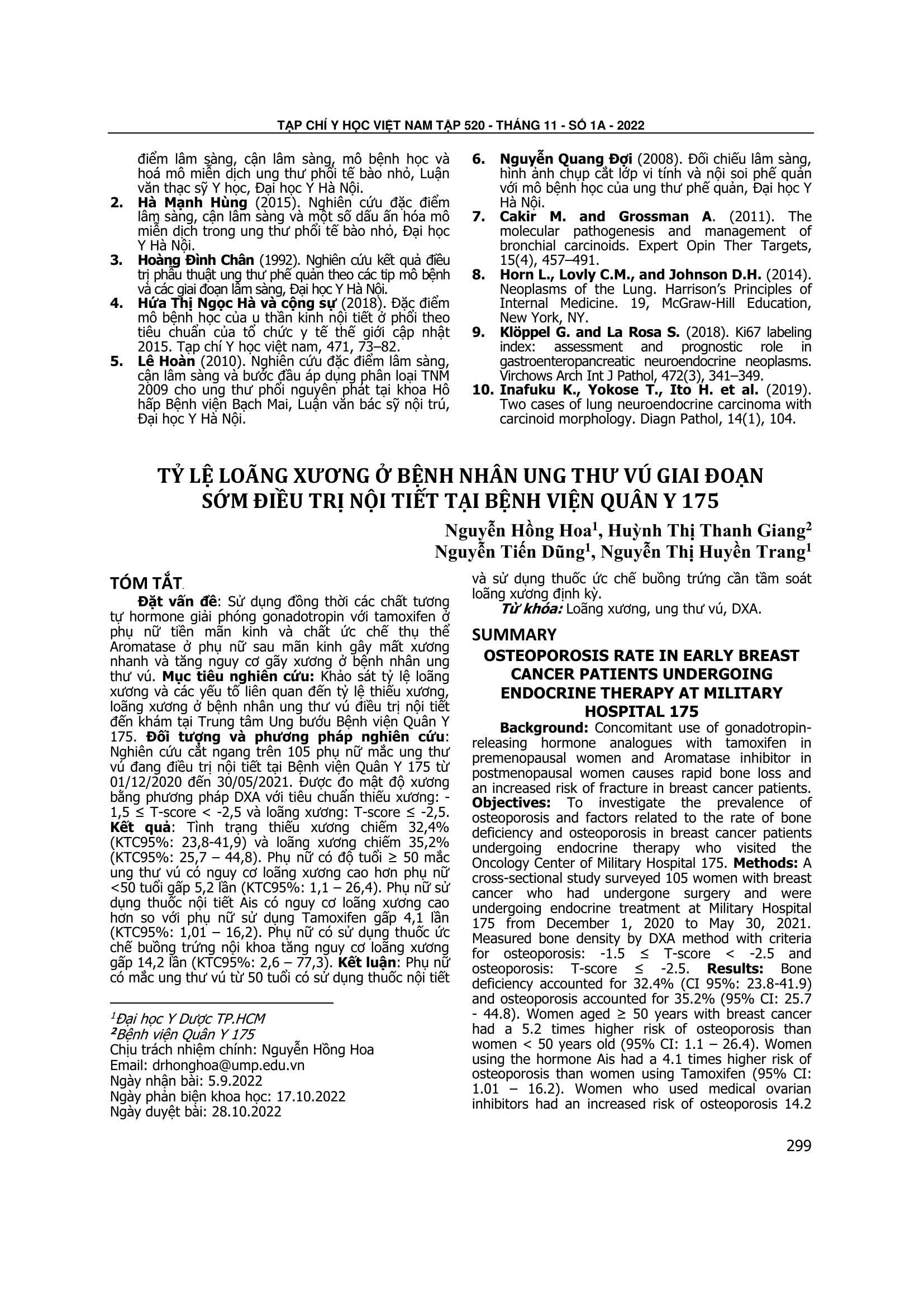 Khảo sát tỷ lệ loãng xương và các yếu tố liên quan đến tỷ lệ thiếu xương, loãng xương ở bệnh nhân ung thư vú điều trị nội tiết đến khám tại Trung tâm Ung bướu Bệnh viện Quân Y 175. Đối tượng và phương pháp nghiên cứu: Nghiên cứu cắt ngang trên 105 phụ nữ mắc ung thư vú đang điều trị nội tiết tại Bệnh viện Quân Y 175 từ 01/12/2020 đến 30/05/2021. Được đo mật độ xương bằng phương pháp DXA với tiêu chuẩn thiếu xương: -1,5 ≤ T-score < -2,5 và loãng xương: T-score ≤ -2,5. Kết quả: Tình trạng thiếu xương chiếm 32,4% (KTC95%: 23,8-41,9) và loãng xương chiếm 35,2% (KTC95%: 25,7 – 44,8). Phụ nữ có độ tuổi ≥ 50 mắc ung thư vú có nguy cơ loãng xương cao hơn phụ nữ <50 tuổi gấp 5,2 lần (KTC95%: 1,1 – 26,4). Phụ nữ sử dụng thuốc nội tiết Ais có nguy cơ loãng xương cao hơn so với phụ nữ sử dụng Tamoxifen gấp 4,1 lần (KTC95%: 1,01 – 16,2). Phụ nữ có sử dụng thuốc ức chế buồng trứng nội khoa tăng nguy cơ loãng xương gấp 14,2 lần (KTC95%: 2,6 – 77,3). Kết luận: Phụ nữ có mắc ung thư vú từ 50 tuổi có sử dụng thuốc nội tiết và sử dụng thuốc ức chế buồng trứng cần tầm soát loãng xương định kỳ.