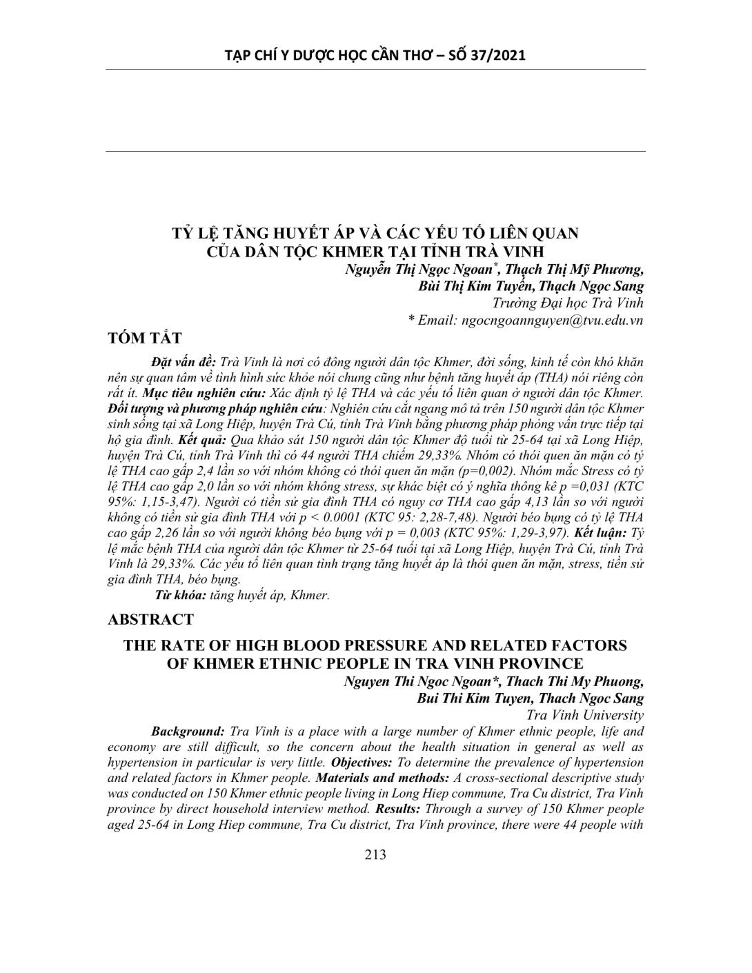 Trà Vinh là nơi có đông người dân tộc Khmer, đời sống, kinh tế còn khó khăn nên sự quan tâm về tình hình sức khỏe nói chung cũng như bệnh tăng huyết áp (THA) nói riêng còn rất ít. Mục tiêu nghiên cứu: Xác định tỷ lệ THA và các yếu tố liên quan ở người dân tộc Khmer. Đối tượng và phương pháp nghiên cứu: Nghiên cứu cắt ngang mô tả trên 150 người dân tộc Khmer sinh sống tại xã Long Hiệp, huyện Trà Cú, tỉnh Trà Vinh bằng phương pháp phỏng vấn trực tiếp tại hộ gia đình. Kết quả: Qua khảo sát 150 người dân tộc Khmer độ tuổi từ 25-64 tại xã Long Hiệp, huyện Trà Cú, tỉnh Trà Vinh thì có 44 người THA chiếm 29,33%. Nhóm có thói quen ăn mặn có tỷ lệ THA cao gấp 2,4 lần so với nhóm không có thói quen ăn mặn (p=0,002). Nhóm mắc Stress có tỷ lệ THA cao gấp 2,0 lần so với nhóm không stress, sự khác biệt có ý nghĩa thông kê p =0,031 (KTC 95%: 1,15-3,47). Người có tiền sử gia đình THA có nguy cơ THA cao gấp 4,13 lần so với người không có tiền sử gia đình THA với p < 0.0001 (KTC 95: 2,28-7,48). Người béo bụng có tỷ lệ THA cao gấp 2,26 lần so với người không béo bụng với p = 0,003 (KTC 95%: 1,29-3,97). Kết luận: Tỷ lệ mắc bệnh THA của người dân tộc Khmer từ 25-64 tuổi tại xã Long Hiệp, huyện Trà Cú, tỉnh Trà Vinh là 29,33%. Các yếu tố liên quan tình trạng tăng huyết áp là thói quen ăn mặn, stress, tiền sử gia đình THA, béo bụng