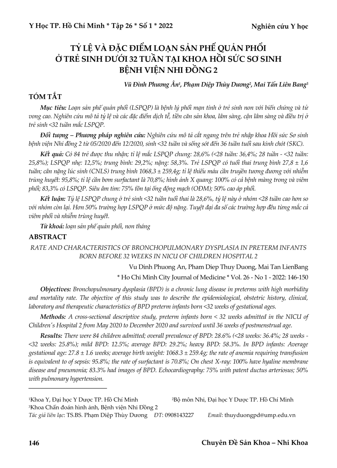 Loạn sản phế quản phổi (LSPQP) là bệnh lý phổi mạn tính ở trẻ sinh non với biến chứng và tử vong cao. Nghiên cứu mô tả tỷ lệ và các đặc điểm dịch tễ, tiền căn sản khoa, lâm sàng, cận lâm sàng và điều trị ở trẻ sinh <32 tuần mắc LSPQP. Đối tượng – Phương pháp nghiên cứu: Nghiên cứu mô tả cắt ngang trên trẻ nhập khoa Hồi sức Sơ sinh bệnh viện Nhi đồng 2 từ 05/2020 đến 12/2020, sinh <32 tuần và sống sót đến 36 tuần tuổi sau kinh chót (SKC). Kết quả: Có 84 trẻ được thu nhận; tỉ lệ mắc LSPQP chung: 28,6% (<28 tuần: 36,4%; 28 tuần - <32 tuần: 25,8%); LSPQP nhẹ: 12,5%; trung bình: 29,2%; nặng: 58,3%. Trẻ LSPQP có tuổi thai trung bình 27,8 ± 1,6 tuần; cân nặng lúc sinh (CNLS) trung bình 1068,3 ± 259,4g; tỉ lệ thiếu máu cần truyền tương đương với nhiễm trùng huyết: 95,8%; tỉ lệ cần bơm surfactant là 70,8%; hình ảnh X quang: 100% có cả bệnh màng trong và viêm phổi; 83,3% có LSPQP. Siêu âm tim: 75% tồn tại ống động mạch (OĐM); 50% cao áp phổi. Kết luận: Tỷ lệ LSPQP chung ở trẻ sinh <32 tuần tuổi thai là 28,6%, tỷ lệ này ở nhóm <28 tuần cao hơn so với nhóm còn lại. Hơn 50% trường hợp LSPQP ở mức độ nặng. Tuyệt đại đa số các trường hợp đều từng mắc cả viêm phổi và nhiễm trùng huyết.