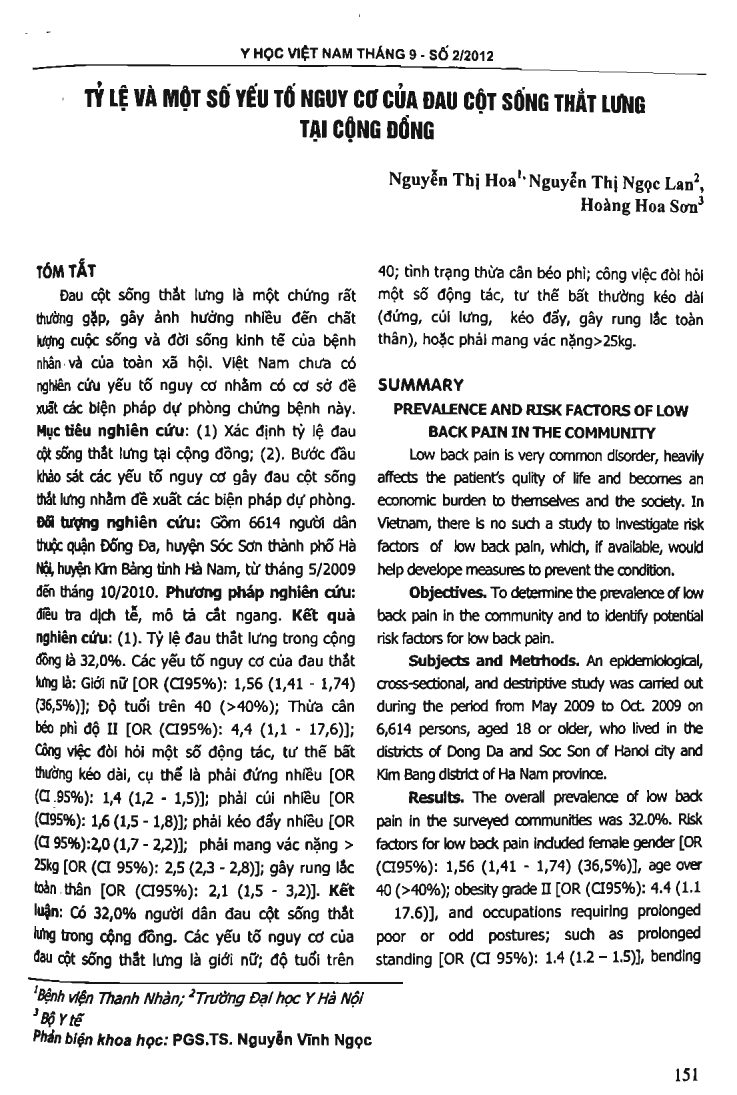 Low back pain is very common disorder, heavily affects the patient's qulity of life and becomes an economic burden to themselves and the society. In Vietnam, there is no such a study to investigate risk. factors of low back pain, which, if available, would help develope measures to prevent the condition. Objectives. To detamine the prevalence of low back pain in the community and to identify potential risk factors for low back pain. Subjects and Methods. An epidemiological, cross-sectional, and desbiptive study was carried out during the period from May 2009 to Oct. 2009 on 6,614 persons, aged 18 or older, who lived in the districts of Dong Da and Soc Son of Hanoi city and Kim Bang district of Ha Nam province. Results: The overall prevalence of low back pain in the surveyed communities was 32.0 percent. Risk factors for low back pain induclecl female gender [OR (CI:95 percent): 1.56 (1.41 - 1.74) (36.5 percent)], age over 40 (40 percent); obesity grade II [OR (CI:95 percent): 4.4 (1.1 - 17.6)], and occupations requiring prolonged poor or odd postures; such as prolonged standing [OR (CI: 95 percent): 1.4 (1.2 - 1.5)], bending [OR (CI: 95 percent): 1.6 (1.5 - 1.8)], pushing and pulling [OR (CI: 95 percent): 2.0 (1.7 - 2.2)]; lifting heavy objects over 25 kg [OR (CI: 95 percent): 2.5 (2.3 - 2.8)]; and body vibrating [OR (CI:95 percent): 2.1 (1.5 - 3.2)]. Condusions. There is 32.0 percent of population in the oommunity reported having low back pain. Risk factors of low back pain indude gender, age, overweighed and obese cxmditions, and certain cxx:upations with prolonged poor postures.