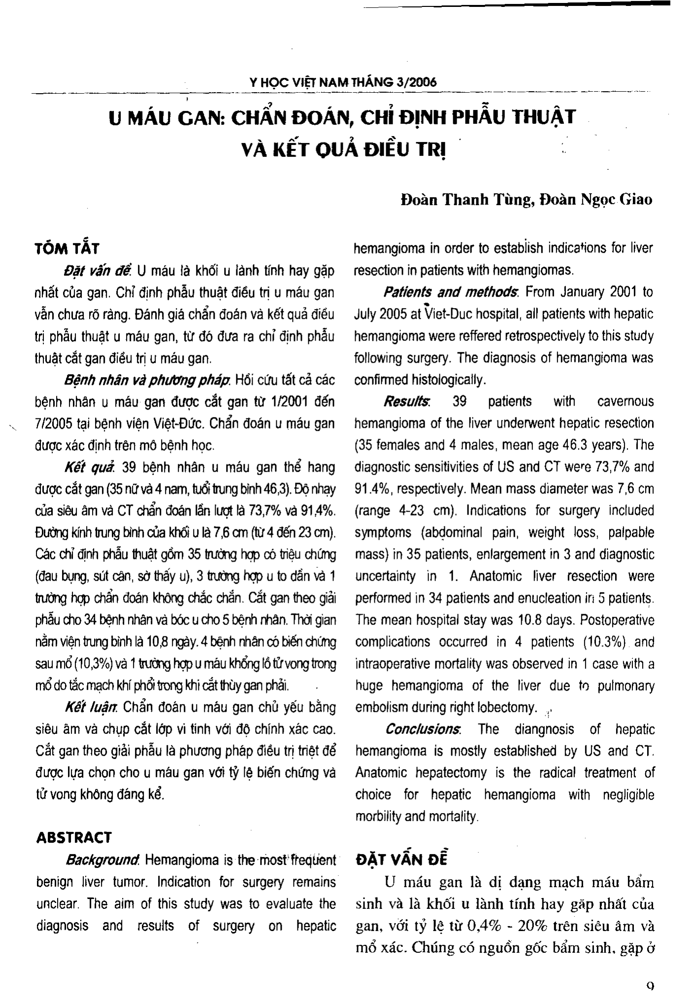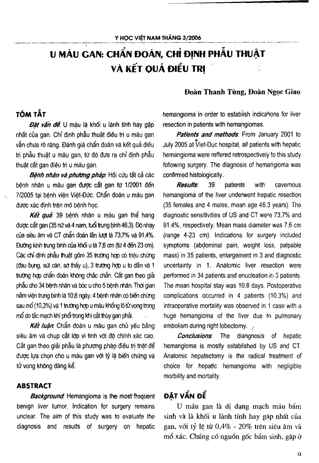 Nghiên cứu hồi cứu tất cả các bệnh nhân u gan được cắt gan từ 1-2001 đến 7-2005 tại bệnh viện Việt - Đức. Chẩn đoán u máu gan được xác định trên mô bệnh học. Kết quả: 39 bệnh nhân u gan thể hang được cắt gan (35 nữ và 4 nam, tuổi trung bình 46,3). Các chỉ định phẫu thuật gồm 35 trường hợp có triệu chứng (đau bụng, sút cân, sờ thấy u), 3 trường hợp u to dần và một trường hợp chẩn đoán không chắc chắn. Cắt gan theo giải phẫu cho 34 bệnh nhân và bóc u cho 5 bệnh nhân. Thời gian trung bình nằm viện là 10,8 ngày. 4 bệnh nhân có biến chứng sau mổ (10,3% ) và 1 trường hợp u máu khổng lồ tử vong trong mổ do tắc mạch khí phổi trong khi cắt thuỳ gan phải. Chẩn đoán u gan chủ yếu bằng siêu âm và chụp cắt lớp vi tính với độ chính xác cao. Cắt gan theo giải phẫu là phương pháp để điều trị triệt để được lựa chọn cho u gan với tỉ lệ biến chứng và tỉ lệ tử vong không đáng kể.