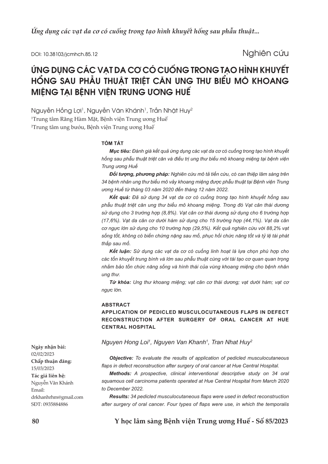 Đánh giá kết quả ứng dụng các vạt da cơ có cuống trong tạo hình khuyết hổng sau phẫu thuật triệt căn và điều trị ung thư biểu mô khoang miệng tại bệnh viện Trung ương Huế Đối tượng, phương pháp: Nghiên cứu mô tả tiến cứu, có can thiệp lâm sàng trên 34 bệnh nhân ung thư biểu mô vảy khoang miệng được phẫu thuật tại Bệnh viện Trung ương Huế từ tháng 03 năm 2020 đến tháng 12 năm 2022. Kết quả: Đã sử dụng 34 vạt da cơ có cuống trong tạo hình khuyết hổng sau phẫu thuật triệt căn ung thư biểu mô khoang miệng. Trong đó Vạt cân thái dương sử dụng cho 3 trường hợp (8,8%). Vạt cân cơ thái dương sử dụng cho 6 trường hợp (17,6%). Vạt da cân cơ dưới hàm sử dụng cho 15 trường hợp (44,1%). Vạt da cân cơ ngực lớn sử dụng cho 10 trường hợp (29,5%). Kết quả nghiên cứu với 88,2% vạt sống tốt, không có biến chứng nặng sau mổ, phục hồi chức năng tốt và tỷ lệ tái phát thấp sau mổ. Kết luận: Sử dụng các vạt da cơ có cuống linh hoạt là lựa chọn phù hợp cho các tổn khuyết trung bình và lớn sau phẫu thuật cùng với tái tạo cơ quan quan trọng nhằm bảo tồn chức năng sống và hình thái của vùng khoang miệng cho bệnh nhân ung thư.