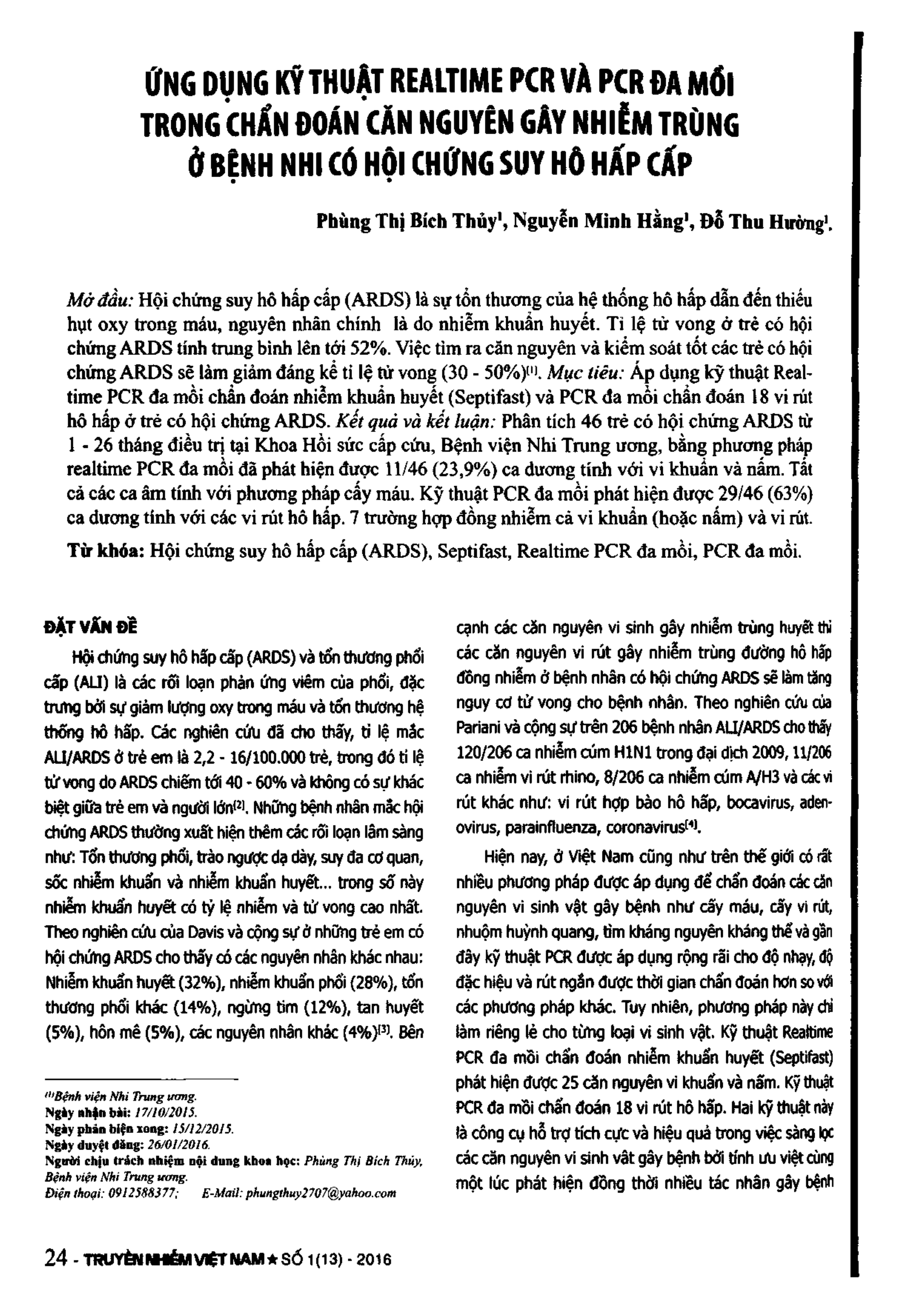 ứng dụng kỹ thuật realtime PCR và PCR đa mồi trong chẩn đoán căn nguyên gây nhiễm trùng ở bệnh nhi có hội chứng suy hô hấp cấp