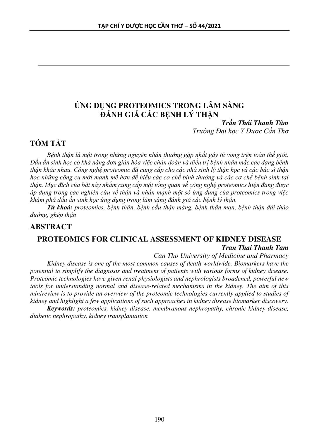 Bệnh thận là một trong những nguyên nhân thường gặp nhất gây tử vong trên toàn thế giới. Dấu ấn sinh học có khả năng đơn giản hóa việc chẩn đoán và điều trị bệnh nhân mắc các dạng bệnh thận khác nhau. Công nghệ proteomic đã cung cấp cho các nhà sinh lý thận học và các bác sĩ thận học những công cụ mới mạnh mẽ hơn để hiểu các cơ chế bình thường và các cơ chế bệnh sinh tại thận. Mục đích của bài này nhằm cung cấp một tổng quan về công nghệ proteomics hiện đang được áp dụng trong các nghiên cứu về thận và nhấn mạnh một số ứng dụng của proteomics trong việc khám phá dấu ấn sinh học ứng dụng trong lâm sàng đánh giá các bệnh lý thận