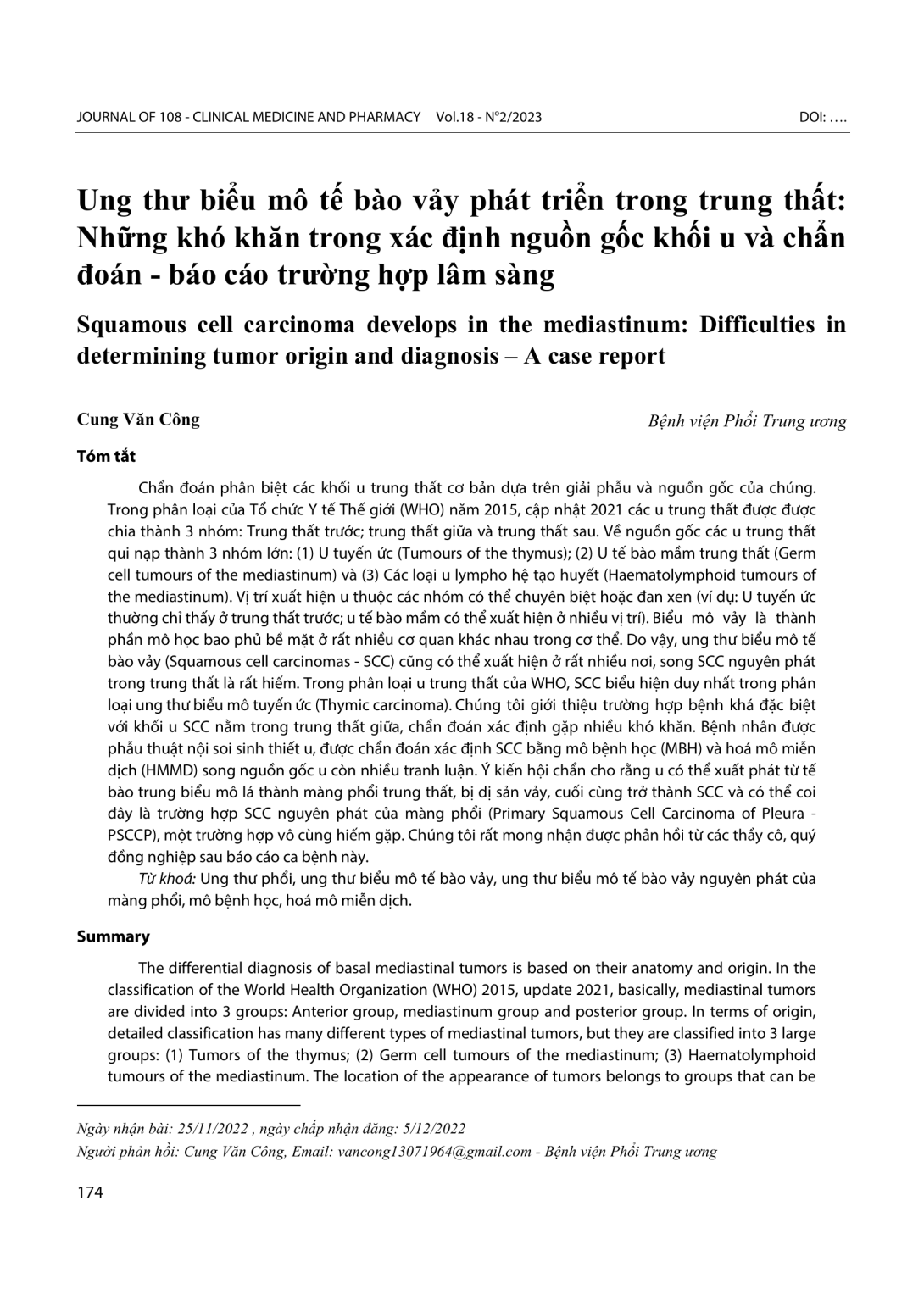 Chẩn đoán phân biệt các khối u trung thất cơ bản dựa trên giải phẫu và nguồn gốc của chúng. Trong phân loại của Tổ chức Y tế Thế giới (WHO) năm 2015, cập nhật 2021 các u trung thất được được chia thành 3 nhóm: Trung thất trước; trung thất giữa và trung thất sau. Về nguồn gốc các u trung thất qui nạp thành 3 nhóm lớn: (1) U tuyến ức (Tumours of the thymus); (2) U tế bào mầm trung thất (Germ cell tumours of the mediastinum) và (3) Các loại u lympho hệ tạo huyết (Haematolymphoid tumours of the mediastinum). Vị trí xuất hiện u thuộc các nhóm có thể chuyên biệt hoặc đan xen (ví dụ: U tuyến ức thường chỉ thấy ở trung thất trước; u tế bào mầm có thể xuất hiện ở nhiều vị trí). Biểu mô vảy là thành phần mô học bao phủ bề mặt ở rất nhiều cơ quan khác nhau trong cơ thể. Do vậy, ung thư biểu mô tế bào vảy (Squamous cell carcinomas - SCC) cũng có thể xuất hiện ở rất nhiều nơi, song SCC nguyên phát trong trung thất là rất hiếm. Trong phân loại u trung thất của WHO, SCC biểu hiện duy nhất trong phân loại ung thư biểu mô tuyến ức (Thymic carcinoma). Chúng tôi giới thiệu trường hợp bệnh khá đặc biệt với khối u SCC nằm trong trung thất giữa, chẩn đoán xác định gặp nhiều khó khăn. Bệnh nhân được phẫu thuật nội soi sinh thiết u, được chẩn đoán xác định SCC bằng mô bệnh học (MBH) và hoá mô miễn dịch (HMMD) song nguồn gốc u còn nhiều tranh luận. Ý kiến hội chẩn cho rằng u có thể xuất phát từ tế bào trung biểu mô lá thành màng phổi trung thất, bị dị sản vảy, cuối cùng trở thành SCC và có thể coi đây là trường hợp SCC nguyên phát của màng phổi (Primary Squamous Cell Carcinoma of Pleura - PSCCP), một trường hợp vô cùng hiếm gặp. Chúng tôi rất mong nhận được phản hồi từ các thầy cô, quý đồng nghiệp sau báo cáo ca bệnh này.