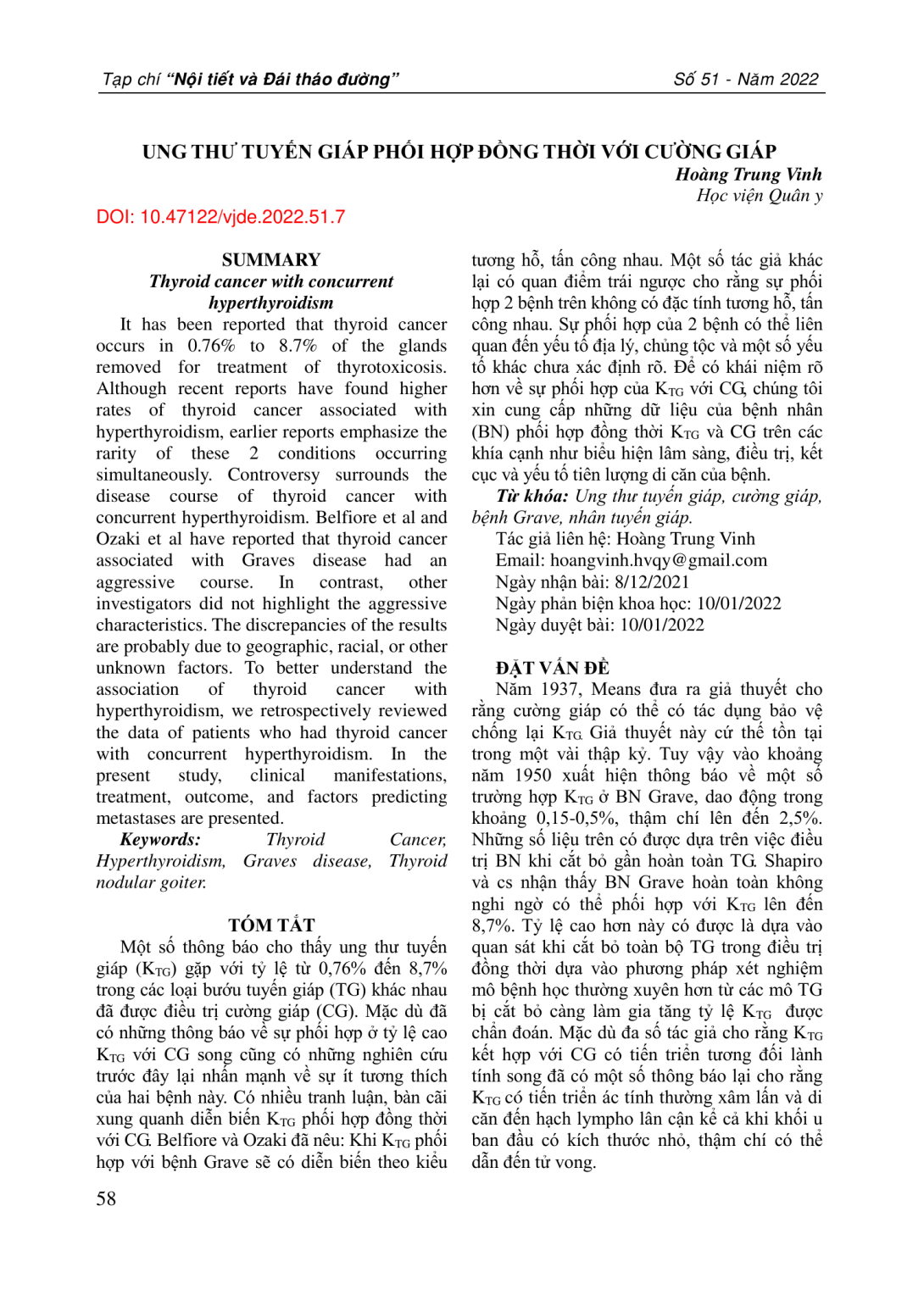 Một số thông báo cho thấy ung thư tuyến giáp (KTG) gặp với tỷ lệ từ 0,76% đến 8,7% trong các loại bướu tuyến giáp (TG) khác nhau đã được điều trị cường giáp (CG). Mặc dù đã có những thông báo về sự phối hợp ở tỷ lệ cao KTG với CG song cũng có những nghiên cứu trước đây lại nhấn mạnh về sự ít tương thích của hai bệnh này. Có nhiều tranh luận, bàn cãi xung quanh diễn biến KTG phối hợp đồng thời với CG. Belfiore và Ozaki đã nêu: Khi KTG phối hợp với bệnh Grave sẽ có diễn biến theo kiểu tương hỗ, tấn công nhau. Một số tác giả khác lại có quan điểm trái ngược cho rằng sự phối hợp 2 bệnh trên không có đặc tính tương hỗ, tấn công nhau. Sự phối hợp của 2 bệnh có thể liên quan đến yếu tố địa lý, chủng tộc và một số yếu tố khác chưa xác định rõ. Để có khái niệm rõ hơn về sự phối hợp của KTG với CG, chúng tôi xin cung cấp những dữ liệu của bệnh nhân (BN) phối hợp đồng thời KTG và CG trên các khía cạnh như biểu hiện lâm sàng, điều trị, kết cục và yếu tố tiên lượng di căn của bệnh.