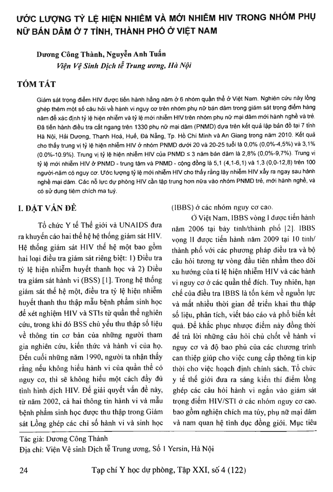 Ước lượng tỷ lệ hiện nhiễm và mới nhiễm HIV trong nhóm phụ nữ bán dâm ở 7 tỉnh, thành phố Việt Nam