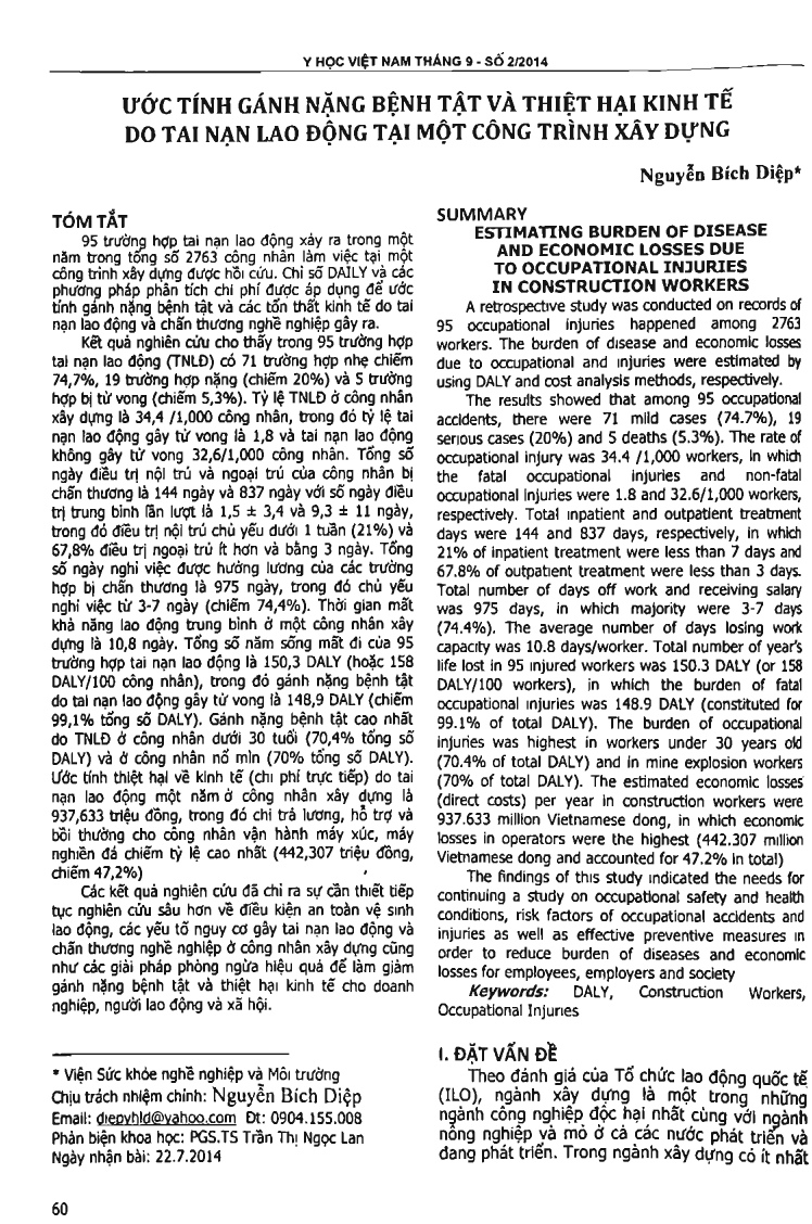 A retrospective study was conducted on records of 95 occupational injuries happened among 2763 workers. The burden of disease and economic losses due to occupational and injuries were estimated by using DALY and cost analysis methods, respectively. The results showed that among 95 occupational accidents, there were 71 mild cases (74.7 percent), 19 serious cases (20 percent) and 5 deaths (5.3 percent). The rate of occupational injury was 34.4 /1,000 workers, in which the fatal occupational injuries and non-fatal occupational injuries were 1.8 and 32.6/1,000 workers, respectively. Total inpatient and outpatient treatment days were 144 and 837 days, respectively, in which 21 percent of inpatient treatment were less than 7 days and 67.8 percent of outpatient treatment were less than 3 days. Total number of days off work and receiving salary was 975 days, in which majority were 3-7 days (74.4 percent). The average number: of days losing work capacity was 10.8 days/worker. Total number of year's life lost in 95 injured workers was 150.3 DALY (or 158 DALY/l00 workers), in which the burden of fatal occupational injuries was 148.9 IDAL Y (constituted for 99.1 percent of total DALY). The b.i:Jrden of occupational injuries was highest in workers under 30 years old (70.4 percent of total DALY) and in mine explosion workers (70 percent of total DALY). The estirnated economic losses (direct costs) per year in construction workers were 937.633 million Vietnamese dong, in which economic losses in operators were the highest (442.307 million Vietnamese dong and accounted for 47.2 percent in total). The findings of this study indicated the needs for continuing a study on occupational safety and health conditions, risk factors of occupational accidents and injuries as well as effective preventive measures in order to reduce burden of diseases and economic losses for employees, employers and society.