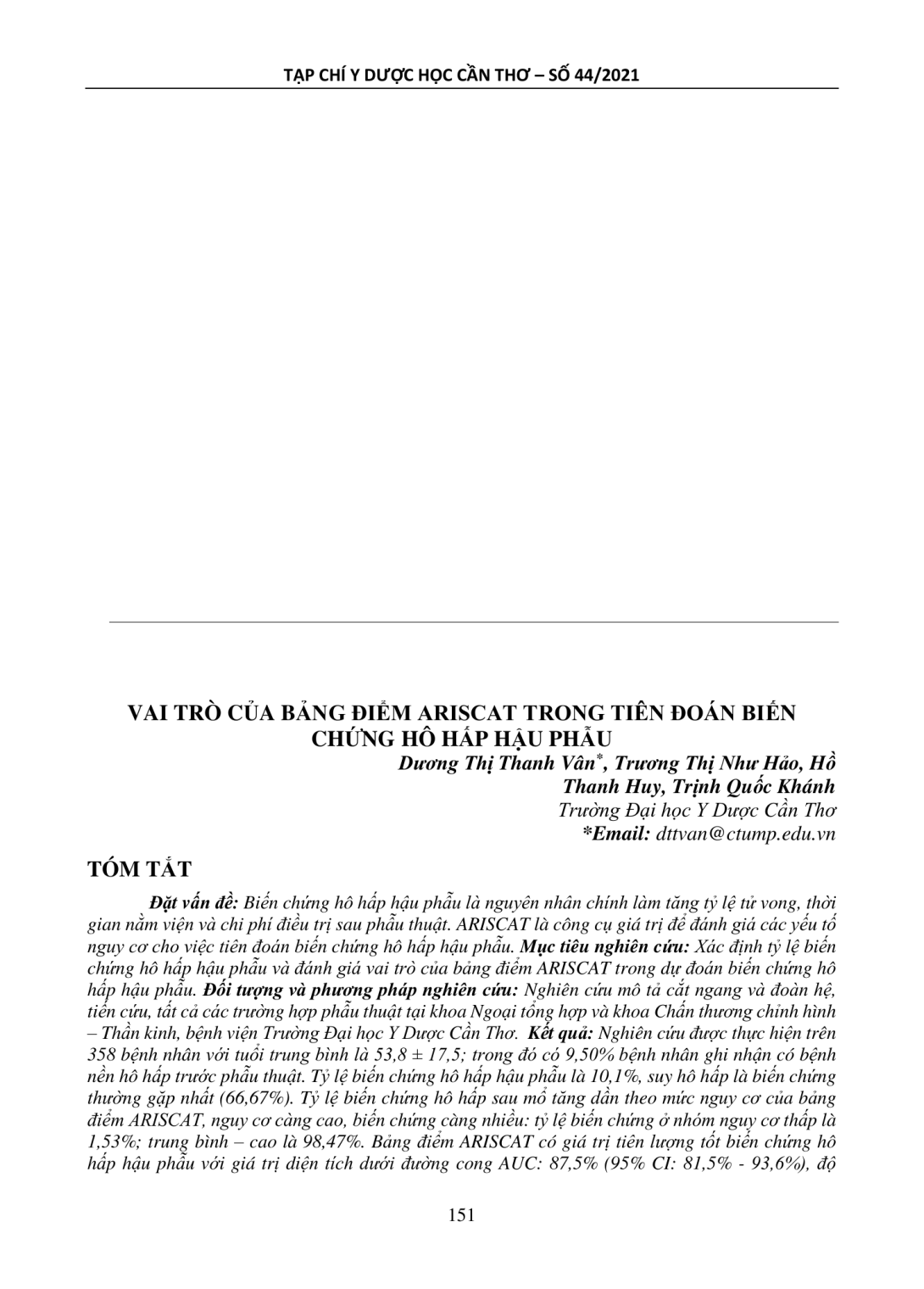 Biến chứng hô hấp hậu phẫu là nguyên nhân chính làm tăng tỷ lệ tử vong, thời gian nằm viện và chi phí điều trị sau phẫu thuật. ARISCAT là công cụ giá trị để đánh giá các yếu tố nguy cơ cho việc tiên đoán biến chứng hô hấp hậu phẫu. Mục tiêu nghiên cứu: Xác định tỷ lệ biến chứng hô hấp hậu phẫu và đánh giá vai trò của bảng điểm ARISCAT trong dự đoán biến chứng hô hấp hậu phẫu. Đối tượng và phương pháp nghiên cứu: Nghiên cứu mô tả cắt ngang và đoàn hệ, tiến cứu, tất cả các trường hợp phẫu thuật tại khoa Ngoại tổng hợp và khoa Chấn thương chỉnh hình – Thần kinh, bệnh viện Trường Đại học Y Dược Cần Thơ. Kết quả: Nghiên cứu được thực hiện trên 358 bệnh nhân với tuổi trung bình là 53,8 ± 17,5; trong đó có 9,50% bệnh nhân ghi nhận có bệnh nền hô hấp trước phẫu thuật. Tỷ lệ biến chứng hô hấp hậu phẫu là 10,1%, suy hô hấp là biến chứng thường gặp nhất (66,67%). Tỷ lệ biến chứng hô hấp sau mổ tăng dần theo mức nguy cơ của bảng điểm ARISCAT, nguy cơ càng cao, biến chứng càng nhiều: tỷ lệ biến chứng ở nhóm nguy cơ thấp là 1,53%; trung bình – cao là 98,47%. Bảng điểm ARISCAT có giá trị tiên lượng tốt biến chứng hô hấp hậu phẫu với giá trị diện tích dưới đường cong AUC: 87,5% (95% CI: 81,5% - 93,6%), đô nhạy: 88,89%, độ đặc hiệu: 80,12%, giá trị tiên đoán dương: 33,33% và giá trị tiên đoán âm: 98,47%. Và không có sự khác biệt về giá trị AUC ở nhóm dân số nghiên cứu chung so với nhóm có và không có bệnh nền hô hấp. Kết luận: Thang điểm ARISCAT có giá trị tiên lượng tốt biến chứng hô hấp hậu phẫu. Mặc dù không có những tiêu chí rõ ràng cho những bệnh nhân có từng bệnh lý hô hấp cụ thể nhưng bảng điểm ARISCAT vẫn có độ nhạy cao và giá trị tiên đoán tốt trên những bệnh nhân có bệnh lý hô hấp.