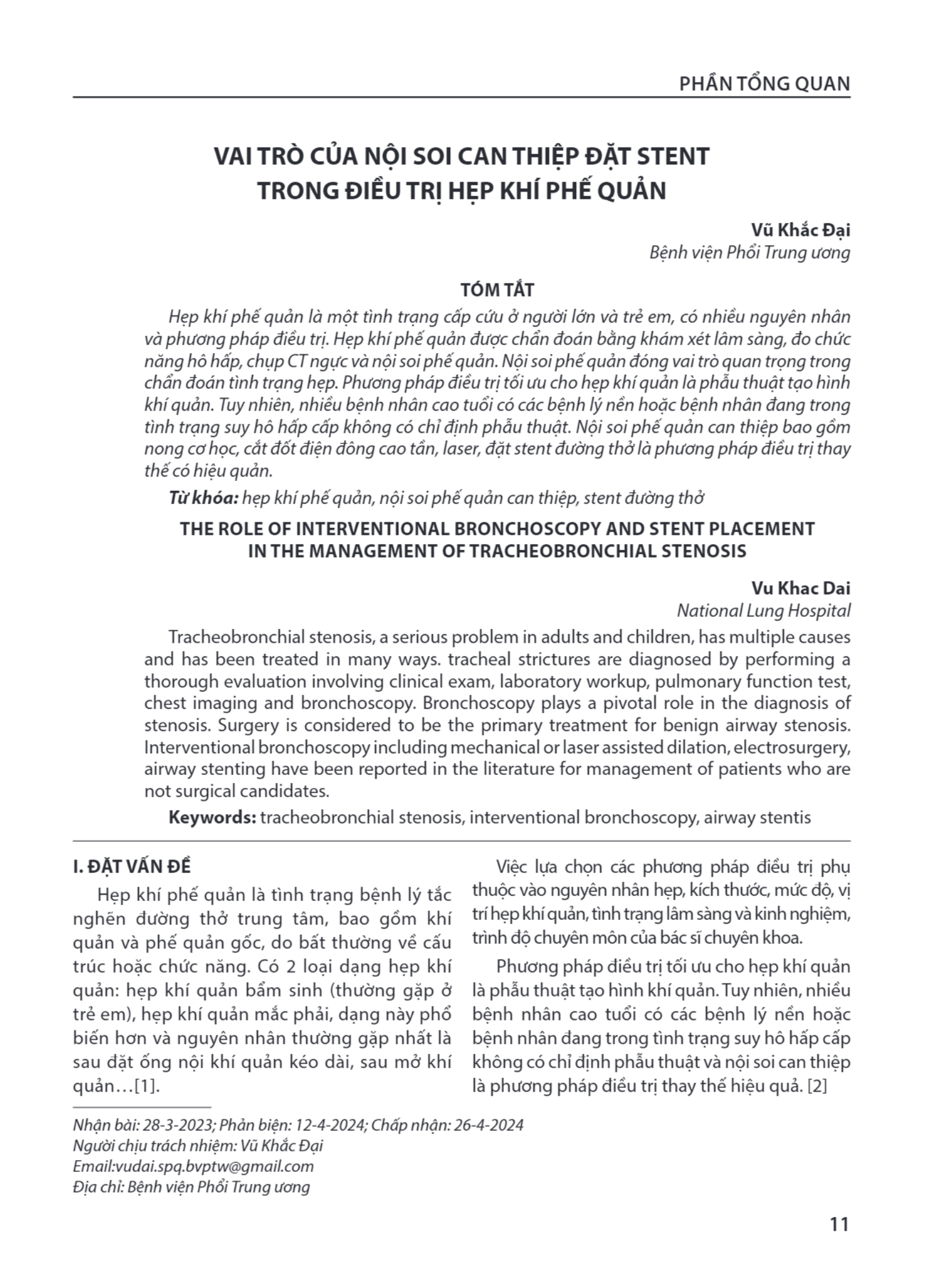 Hẹp khí phế quản là một tình trạng cấp cứu ở người lớn và trẻ em, có nhiều nguyên nhân và phương pháp điều trị. Hẹp khí phế quản được chẩn đoán bằng khám xét lâm sàng, đo chức năng hô hấp, chụp CT ngực và nội soi phế quản. Nội soi phế quản đóng vai trò quan trọng trong chẩn đoán tình trạng hẹp. Phương pháp điều trị tối ưu cho hẹp khí quản là phẫu thuật tạo hình khí quản. Tuy nhiên, nhiều bệnh nhân cao tuổi có các bệnh lý nền hoặc bệnh nhân đang trong tình trạng suy hô hấp cấp không có chì đinh phẫu thuật. Nội soi phế quản can thiệp bao gốm nong cơ học, cắt đốt điện đông cao tần, laser, đặt stent đường thở là phương pháp điều trị thay thế có hiệu quản.