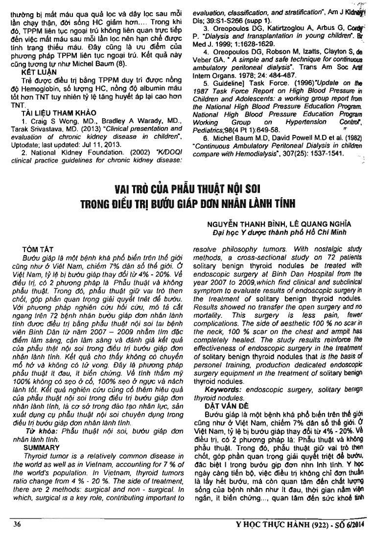 Thyroid tumor is a relatively common disease in the world as well as in Vietnam, accounting for 7 percent of the world's population. In Vietnam, thyroid tumors ratio change from 4 percent - 20 percent. The side of treatment, there are 2 methods: surgical and non - surgical. In which, surgical is a key role, contributing important to resolve philosophy tumors. With nostalgic study methods, a cross-sectional study on 72 patients solitary benign thyroid nodules be treated with endoscopic surgery at Binh Dan Hospital from the year 2007 to 2009, which find clinical and subclinical symptom to evaluate results of endoscopic surgery in the treatment of solitary benign thyroid nodules. Results showed no transff]r the open surgery and no mortality. This surgery is. less pain, fewer complications. The side of aesthetic 100 percent no scar in the neck, 100 percent scar on the chest and armpit has completely healed. The study results reinforce the effectiveness of endoscopic surgery in the treatment of solitary benign thyroid nodules that is the basis of personel training, production dedicated endoscopic surgery equipment in the treatment of solitary benign thyroid nodules.