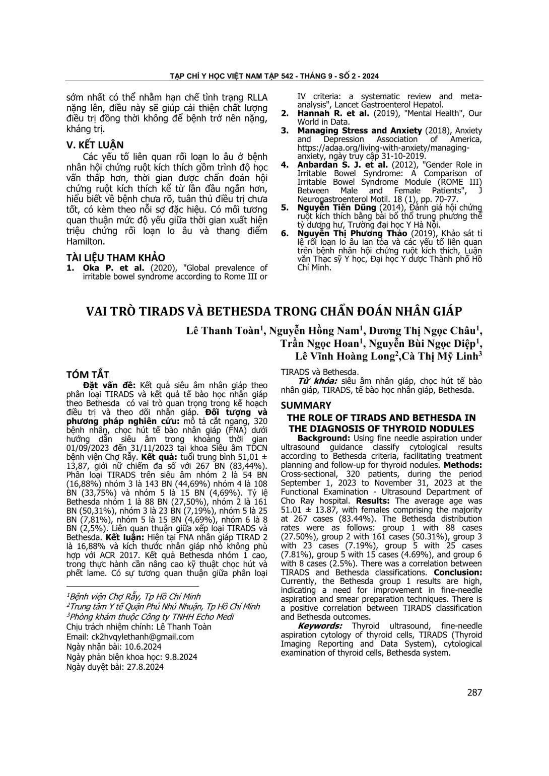 Kết quả siêu âm nhân giáp theo phân loại TIRADS và kết quả tế bào học nhân giáp theo Bethesda có vai trò quan trọng trong kế hoạch điều trị và theo dõi nhân giáp. Đối tượng và phương pháp nghiên cứu: mô tả cắt ngang, 320 bệnh nhân, chọc hút tế bào nhân giáp (FNA) dưới hướng dẫn siêu âm trong khoảng thời gian 01/09/2023 đến 31/11/2023 tại khoa Siêu âm TDCN bệnh viện Chợ Rẫy. Kết quả: tuổi trung bình 51,01 ± 13,87, giới nữ chiếm đa số với 267 BN (83,44%). Phân loại TIRADS trên siêu âm nhóm 2 là 54 BN (16,88%) nhóm 3 là 143 BN (44,69%) nhóm 4 là 108 BN (33,75%) và nhóm 5 là 15 BN (4,69%). Tỷ lệ Bethesda nhóm 1 là 88 BN (27,50%), nhóm 2 là 161 BN (50,31%), nhóm 3 là 23 BN (7,19%), nhóm 5 là 25 BN (7,81%), nhóm 5 là 15 BN (4,69%), nhóm 6 là 8 BN (2,5%). Liên quan thuận giữa xếp loại TIRADS và Bethesda. Kết luận: Hiện tại FNA nhân giáp TIRAD 2 là 16,88% và kích thước nhân giáp nhỏ không phù hợp với ACR 2017. Kết quả Bethesda nhóm 1 cao, trong thực hành cần nâng cao kỹ thuật chọc hút và phết lame. Có sự tương quan thuận giữa phân loại TIRADS và Bethesda.
