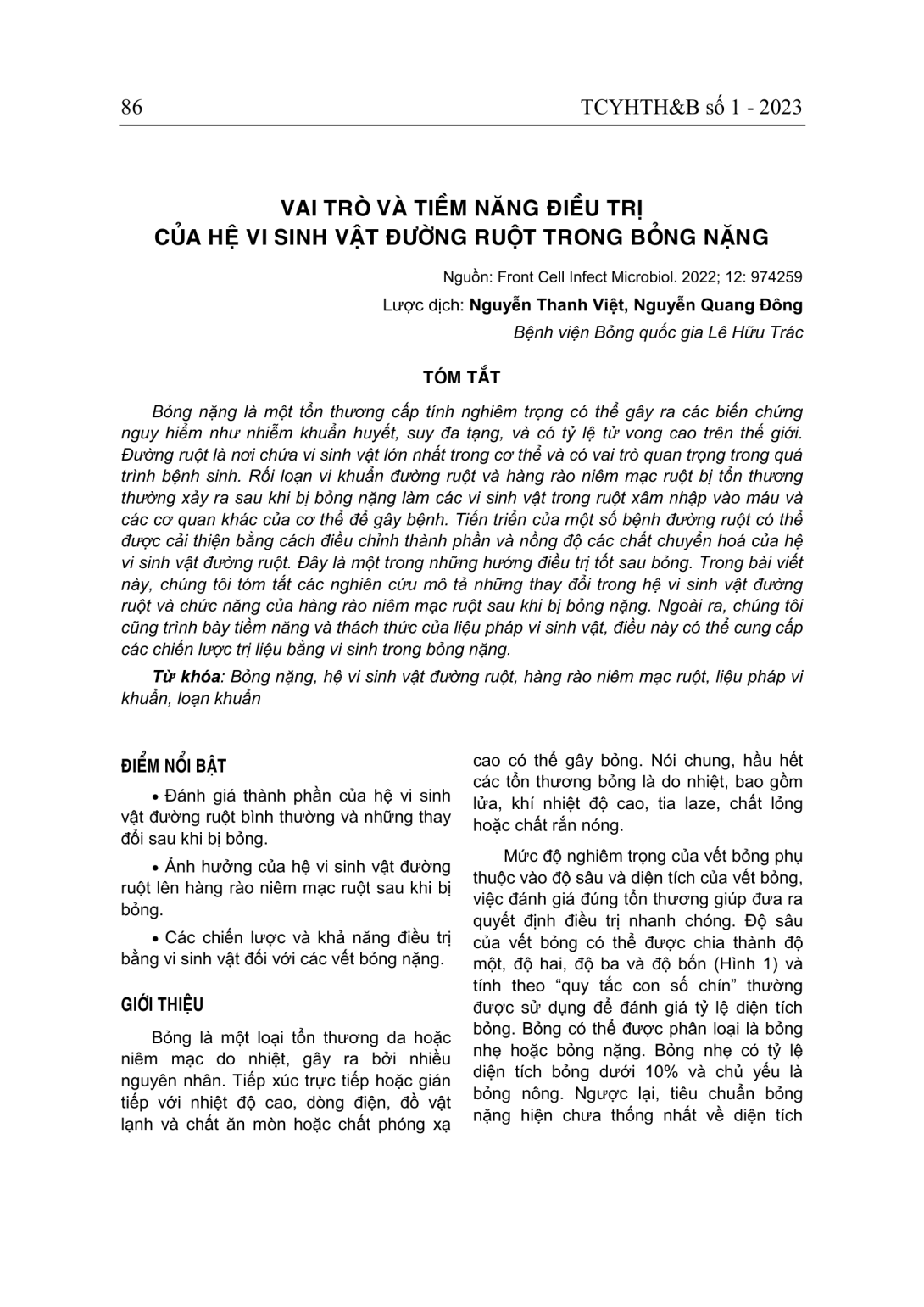 Bỏng nặng là một tổn thương cấp tính nghiêm trọng có thể gây ra các biến chứng nguy hiểm như nhiễm khuẩn huyết, suy đa tạng, và có tỷ lệ tử vong cao trên thế giới. Đường ruột là nơi chứa vi sinh vật lớn nhất trong cơ thể và có vai trò quan trọng trong quá trình bệnh sinh. Rối loạn vi khuẩn đường ruột và hàng rào niêm mạc ruột bị tổn thương thường xảy ra sau khi bị bỏng nặng làm các vi sinh vật trong ruột xâm nhập vào máu và các cơ quan khác của cơ thể để gây bệnh. Tiến triển của một số bệnh đường ruột có thể được cải thiện bằng cách điều chỉnh thành phần và nồng độ các chất chuyển hoá của hệ vi sinh vật đường ruột. Đây là một trong những hướng điều trị tốt sau bỏng. Trong bài viết này, chúng tôi tóm tắt các nghiên cứu mô tả những thay đổi trong hệ vi sinh vật đường ruột và chức năng của hàng rào niêm mạc ruột sau khi bị bỏng nặng. Ngoài ra, chúng tôi cũng trình bày tiềm năng và thách thức của liệu pháp vi sinh vật, điều này có thể cung cấp các chiến lược trị liệu bằng vi sinh trong bỏng nặng.