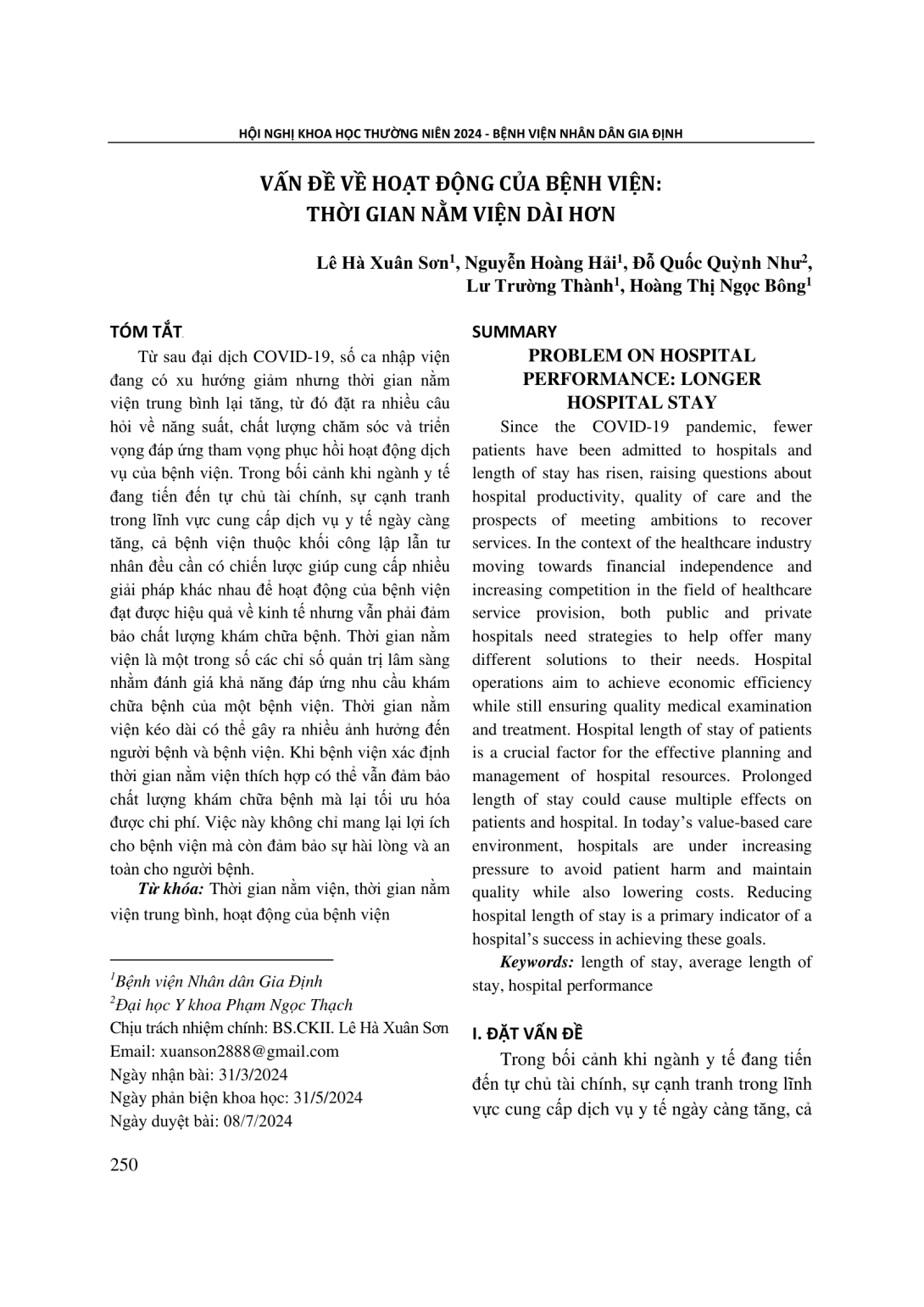 Từ sau đại dịch COVID-19, số ca nhập viện đang có xu hướng giảm nhưng thời gian nằm viện trung bình lại tăng, từ đó đặt ra nhiều câu hỏi về năng suất, chất lượng chăm sóc và triển vọng đáp ứng tham vọng phục hồi hoạt động dịch vụ của bệnh viện. Trong bối cảnh khi ngành y tế đang tiến đến tự chủ tài chính, sự cạnh tranh trong lĩnh vực cung cấp dịch vụ y tế ngày càng tăng, cả bệnh viện thuộc khối công lập lẫn tư nhân đều cần có chiến lược giúp cung cấp nhiều giải pháp khác nhau để hoạt động của bệnh viện đạt được hiệu quả về kinh tế nhưng vẫn phải đảm bảo chất lượng khám chữa bệnh. Thời gian nằm viện là một trong số các chỉ số quản trị lâm sàng nhằm đánh giá khả năng đáp ứng nhu cầu khám chữa bệnh của một bệnh viện. Thời gian nằm viện kéo dài có thể gây ra nhiều ảnh hưởng đến người bệnh và bệnh viện. Khi bệnh viện xác định thời gian nằm viện thích hợp có thể vẫn đảm bảo chất lượng khám chữa bệnh mà lại tối ưu hóa được chi phí. Việc này không chỉ mang lại lợi ích cho bệnh viện mà còn đảm bảo sự hài lòng và an toàn cho người bệnh.