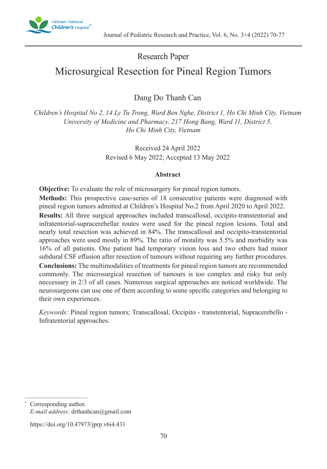 Đánh giá vai trò vi phẫu thuật trong điều trị u vùng tuyến tùng. Phương pháp: Nghiên cứu tiến cứu mô tả 18 bệnh nhân u vùng tuyến tùng đã được điều trị vi phẫu thuật tại BV Nhi đồng 2 từ tháng 04/2020 đến tháng 04/2022. Kết quả: Chúng tôi ứng dụng 3 đường mổ chính cho u vùng tuyến tùng: đường mổ xuyên thể chai, đường mổ chẩm - xuyên lều và đường mổ dưới lều - trên tiểu não. Tỉ lệ lấy toàn bộ và gần hết u đạt 84%. Trong đó, hai đường mổ xuyên thể chai và chẩm - xuyên lều được sử dụng nhiều nhất 89%. Có 1 trường hợp tử vong (5,5%). Tỉ lệ biến chứng 16% với một bệnh nhân bị giảm thị lực tạm thời và hai bệnh nhân bị tụ dịch dưới màng cứng. Kết luận: Ngày nay, điều trị cho các sang thương vùng tuyến tùng cần kết hợp đa mô thức. Vi phẫu thuật cần thiết trong khoảng 2/3 trường hợp. Mỗi đường mổ đều có ưu khuyết điểm riêng. Việc lựa chọn đường mổ phù hợp tuỳ thuộc vào nhiều yếu tố và kinh nghiệm của phẫu thuật viên.
