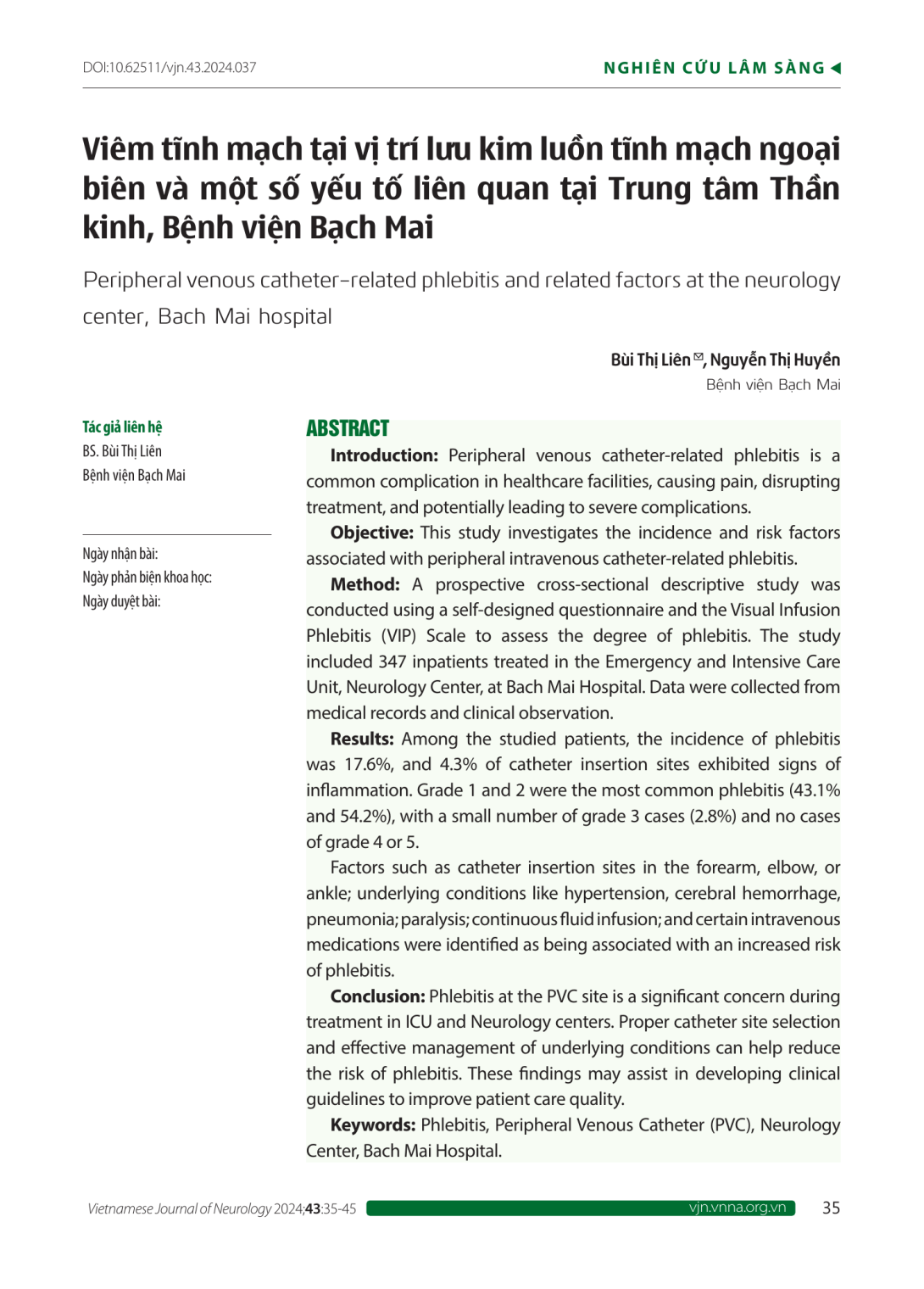 Viêm tĩnh mạch tại vị trí lưu kim luồn tĩnh mạch ngoại biên (Peripheral Venous Catheter - PVC) là một biến chứng phổ biến trong các cơ sở y tế, gây ra đau đớn, gián đoạn điều trị và có khả năng dẫn đến các biến chứng nghiêm trọng. Mục tiêu: Bài báo này nhằm mục đích khảo sát tỷ lệ viêm tĩnh mạch và các yếu tố nguy cơ liên quan đến viêm tĩnh mạch tại vị trí lưu kim luồn tĩnh mạch ngoại biên (KLTMNB) trên người bệnh. Phương pháp nghiên cứu: Phương pháp nghiên cứu mô tả cắt ngang, sử dụng bộ câu hỏi tự tạo, lấy sẵn thang điểm VIP (Visual Infision Phlebitis Scale) về mức độ viêm tĩnh mạch, được tiến hành trên 347 bệnh nhân điều trị nội trú có đặt kim luồn tĩnh mạch ngoại biên tại phòng Cấp cứu và Hồi sức tích cực, Trung tâm Thần kinh, bệnh viện Bạch Mai. Dữ liệu được thu thập từ hồ sơ bệnh án và quan sát lâm sàng. Kết quả: Trong số các bệnh nhân được nghiên cứu, tỷ lệ người bệnh xuất hiện viêm tĩnh mạch tại vị trí lưu KLTMNB là 17.6%; 4.3% vị trí đặt kim truyền có xuất hiện tình trạng viêm. Mức độ viêm phổ biến là độ 1 (43.1%) và độ 2 (54.2%), một số ít có viêm độ 3(2.8%), không có viêm độ 4, độ 5. Những yếu tố như vị trí đặt kim ở cẳng tay, khuỷu tay hay cổ chân; các bệnh lý như tăng huyết áp, chảy máu não, viêm phổi; tình trạng liệt các chi; truyền dịch liên tục và một số loại thuốc duy trì đường tĩnh mạch được xác định là có liên quan đến nguy cơ viêm tĩnh mạch. Kết luận: Viêm tĩnh mạch tại vị trí lưu KLTMNB là một vấn đề cần được chú ý trong quá trình điều trị. Việc lựa chọn vị trí đặt kim hợp lý, cùng với quản lý tốt các bệnh lý nền, có thể giúp giảm thiểu nguy cơ viêm tĩnh mạch. Những kết quả này có thể hỗ trợ trong việc đưa ra các hướng dẫn lâm sàng để nâng cao chất lượng chăm sóc bệnh nhân.