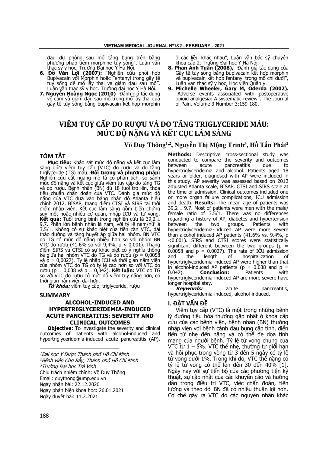 Khảo sát mức độ nặng và kết cục lâm sàng giữa viêm tuỵ cấp (VTC) do rượu và do tăng triglyceride (TG) máu. Đối tượng và phương pháp: Nghiên cứu cắt ngang mô tả có phân tích, so sánh mức độ nặng và kết cục giữa viêm tuỵ cấp do tăng TG và do rượu. Bệnh nhân (BN) đủ 18 tuổi trở lên, thỏa tiêu chuẩn chẩn đoán của VTC. Đánh giá mức độ nặng của VTC dựa vào bảng phân độ Atlanta hiệu chỉnh 2012, BISAP, thang điểm CTSI và SIRS tại thời điểm nhập viện. Kết cục lâm sàng gồm biến chứng suy một hoặc nhiều cơ quan, nhập ICU và tử vong. Kết quả: Tuổi trung bình trong nghiên cứu là 39,2 9,7. Phần lớn bệnh nhân là nam, với tỷ lệ nam/nữ là 3,5/1. Không có sự khác biệt của tiền căn VTC, đái tháo đường và tăng huyết áp giữa hai nhóm. BN VTC do TG có mức độ nặng nhiều hơn so với nhóm BN VTC do rượu (41,6% so với 9,4%, p < 0,001). Thang điểm SIRS và CTSI có sự khác biệt có ý nghĩa thống kê giữa hai nhóm VTC do TG và do rượu (p = 0,0058 và p = 0,0027). Tỷ lệ nhập ICU và thời gian nằm viện của nhóm VTC do TG có tỷ lệ cao hơn so với VTC do rượu (p = 0,038 và p = 0,042). Kết luận: VTC do TG so với VTC do rượu có mức độ viêm tụy nặng hơn, có thời gian nằm viện dài hơn.