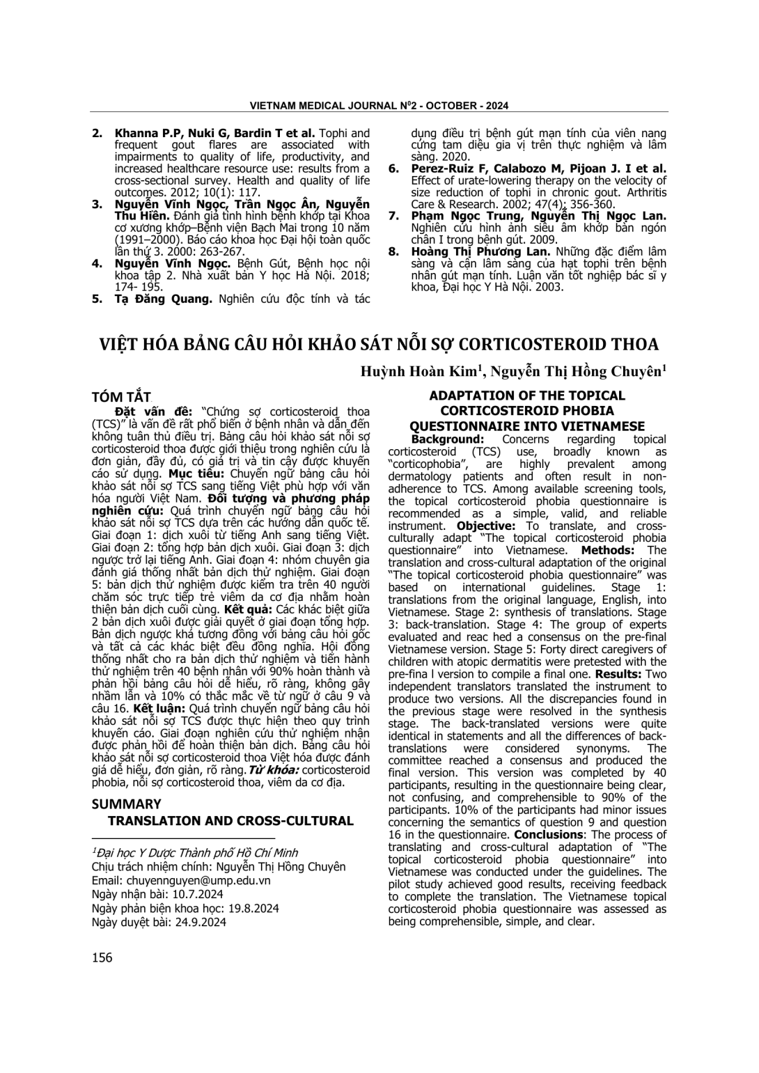 Concerns regarding topical corticosteroid (TCS) use, broadly known as “corticophobia”, are highly prevalent among dermatology patients and often result in non-adherence to TCS. Among available screening tools, the topical corticosteroid phobia questionnaire is recommended as a simple, valid, and reliable instrument. Objective: To translate, and cross-culturally adapt “The topical corticosteroid phobia questionnaire” into Vietnamese. Methods: The translation and cross-cultural adaptation of the original “The topical corticosteroid phobia questionnaire” was based on international guidelines. Stage 1: translations from the original language, English, into Vietnamese. Stage 2: synthesis of translations. Stage 3: back-translation. Stage 4: The group of experts evaluated and reac hed a consensus on the pre‐final Vietnamese version. Stage 5: Forty direct caregivers of children with atopic dermatitis were pretested with the pre‐fina l version to compile a final one. Results: Two independent translators translated the instrument to produce two versions. All the discrepancies found in the previous stage were resolved in the synthesis stage. The back-translated versions were quite identical in statements and all the differences of back-translations were considered synonyms. The committee reached a consensus and produced the final version. This version was completed by 40 participants, resulting in the questionnaire being clear, not confusing, and comprehensible to 90% of the participants. 10% of the participants had minor issues concerning the semantics of question 9 and question 16 in the questionnaire. Conclusions: The process of translating and cross-cultural adaptation of “The topical corticosteroid phobia questionnaire” into Vietnamese was conducted under the guidelines. The pilot study achieved good results, receiving feedback to complete the translation. The Vietnamese topical corticosteroid phobia questionnaire was assessed as being comprehensible, simple, and clear.