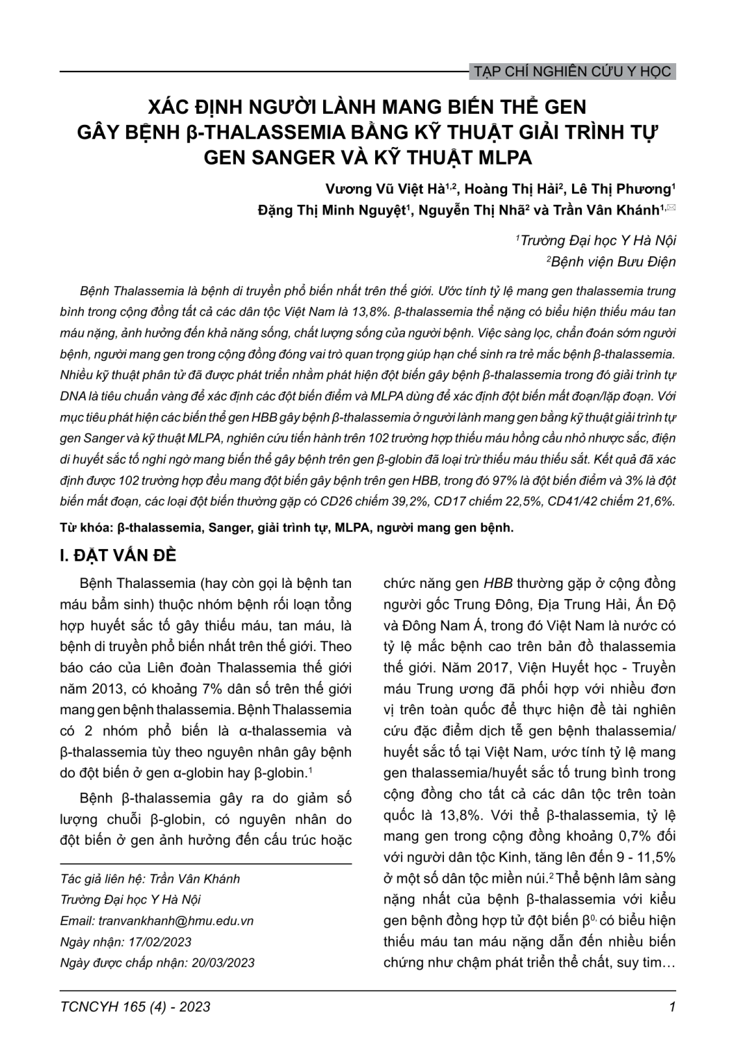 Bệnh Thalassemia là bệnh di truyền phổ biến nhất trên thế giới. Ước tính tỷ lệ mang gen thalassemia trung bình trong cộng đồng tất cả các dân tộc Việt Nam là 13,8%. β-thalassemia thể nặng có biểu hiện thiếu máu tan máu nặng, ảnh hưởng đến khả năng sống, chất lượng sống của người bệnh. Việc sàng lọc, chẩn đoán sớm người bệnh, người mang gen trong cộng đồng đóng vai trò quan trọng giúp hạn chế sinh ra trẻ mắc bệnh β-thalassemia. Nhiều kỹ thuật phân tử đã được phát triển nhằm phát hiện đột biến gây bệnh β-thalassemia trong đó giải trình tự DNA là tiêu chuẩn vàng để xác định các đột biến điểm và MLPA dùng để xác định đột biến mất đoạn/lặp đoạn. Với mục tiêu phát hiện các biến thể gen HBB gây bệnh β-thalassemia ở người lành mang gen bằng kỹ thuật giải trình tự gen Sanger và kỹ thuật MLPA, nghiên cứu tiến hành trên 102 trường hợp thiếu máu hồng cầu nhỏ nhược sắc, điện di huyết sắc tố nghi ngờ mang biến thể gây bệnh trên gen β-globin đã loại trừ thiếu máu thiếu sắt. Kết quả đã xác định được 102 trường hợp đều mang đột biến gây bệnh trên gen HBB, trong đó 97% là đột biến điểm và 3% là đột biến mất đoạn, các loại đột biến thường gặp có CD26 chiếm 39,2%, CD17 chiếm 22,5%, CD41/42 chiếm 21,6%.