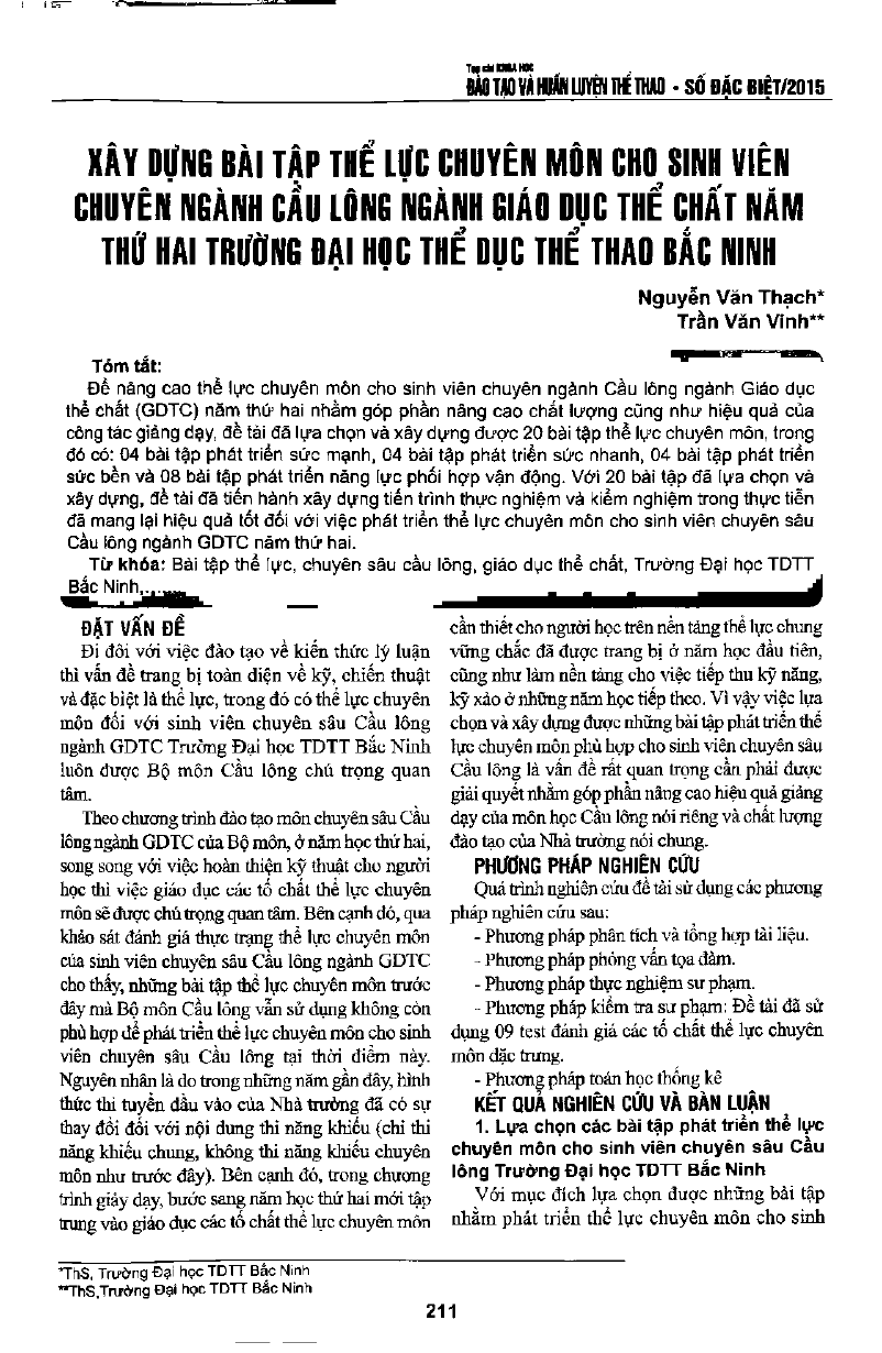 Xây dựng bài tập thể lực chuyên môn cho sinh viên chuyên ngành cầu lông ngành Giáo dục thể chất năm thứ hai trường Đại học Thể dục thể thao Bắc Ninh