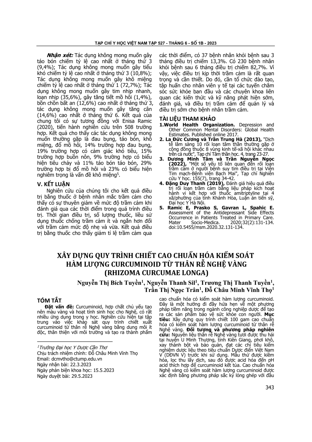 Xây dựng quy trình chiết 100 gam cao chuẩn hóa có kiểm soát hàm lượng curcuminoid từ thân rễ Nghệ vàng. Đối tượng và phương pháp nghiên cứu: Nguyên liệu thân rễ Nghệ vàng tươi được thu hái tại huyện U Minh Thượng, tỉnh Kiên Giang, phơi khô, xay thành bột và bảo quản, đạt các chỉ tiêu kiểm nghiệm dược liệu theo tiêu chuẩn Dược điển Việt Nam V (DĐVN V) trước khi sử dụng. Mẫu thử được kiềm hóa, lọc thu lấy dịch, sau đó được acid hóa đến pH acid thích hợp để curcuminoid kết tủa. Cao chuẩn hóa Nghệ vàng có kiểm soát hàm lượng curcuminoid được xác định bằng phương pháp sắc ký lỏng ghép với đầu dò dãy diod quang (HPLC/PDA). Kết quả: Điều kiện chiết xuất khảo sát được, bao gồm: dung dịch NaOH, pH kiềm = 13, dung dịch acid tartaric, pH acid hóa dịch kiềm = 3, thời gian lắng tủa là 4 giờ. Từ 2 Kg bột Nghệ đạt tiêu chuẩn DĐVN V thu được 100 g cao định chuẩn Nghệ vàng chứa 27,5% curcuminoid toàn phần. Kết luận: Nghiên cứu đã xây dựng thành công quy trình chiết cao chuẩn hóa có kiểm soát hàm lượng curcuminoid từ quy mô 2 kg bột Nghệ vàng và có tiềm năng triển khai trên quy mô pilot.