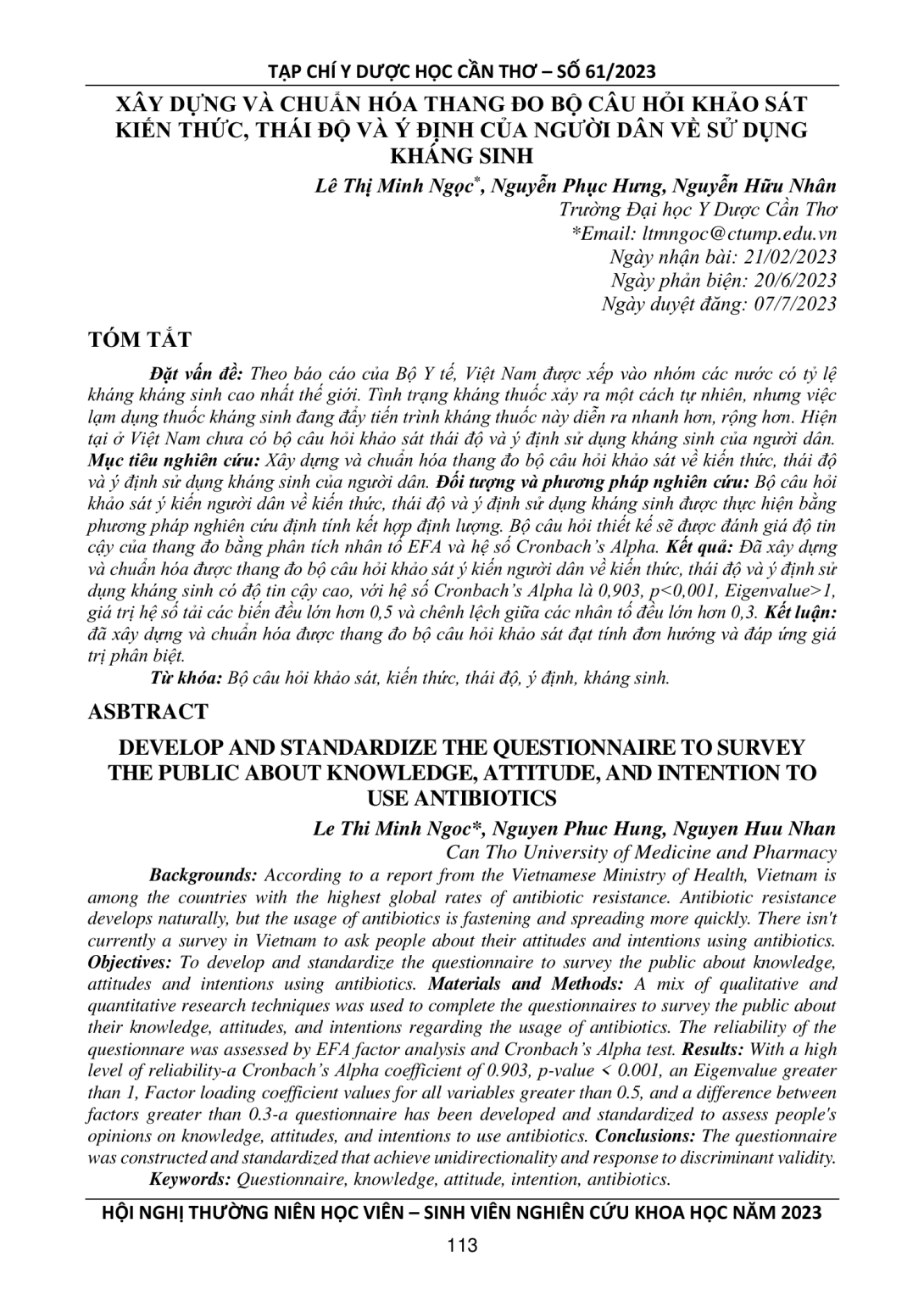 According to a report from the Vietnamese Ministry of Health, Vietnam is among the countries with the highest global rates of antibiotic resistance. Antibiotic resistance develops naturally, but the usage of antibiotics is fastening and spreading more quickly. There isn't currently a survey in Vietnam to ask people about their attitudes and intentions using antibiotics. Objectives: To develop and standardize the questionnaire to survey the public about knowledge, attitudes and intentions using antibiotics. Materials and Methods: A mix of qualitative and quantitative research techniques was used to complete the questionnaires to survey the public about their knowledge, attitudes, and intentions regarding the usage of antibiotics. The reliability of the questionnare was assessed by EFA factor analysis and Cronbach’s Alpha test. Results: With a high level of reliability-a Cronbach’s Alpha coefficient of 0.903, p-value < 0.001, an Eigenvalue greater than 1, Factor loading coefficient values for all variables greater than 0.5, and a difference between factors greater than 0.3-a questionnaire has been developed and standardized to assess people's opinions on knowledge, attitudes, and intentions to use antibiotics. Conclusions: The questionnaire was constructed and standardized that achieve unidirectionality and response to discriminant validity.