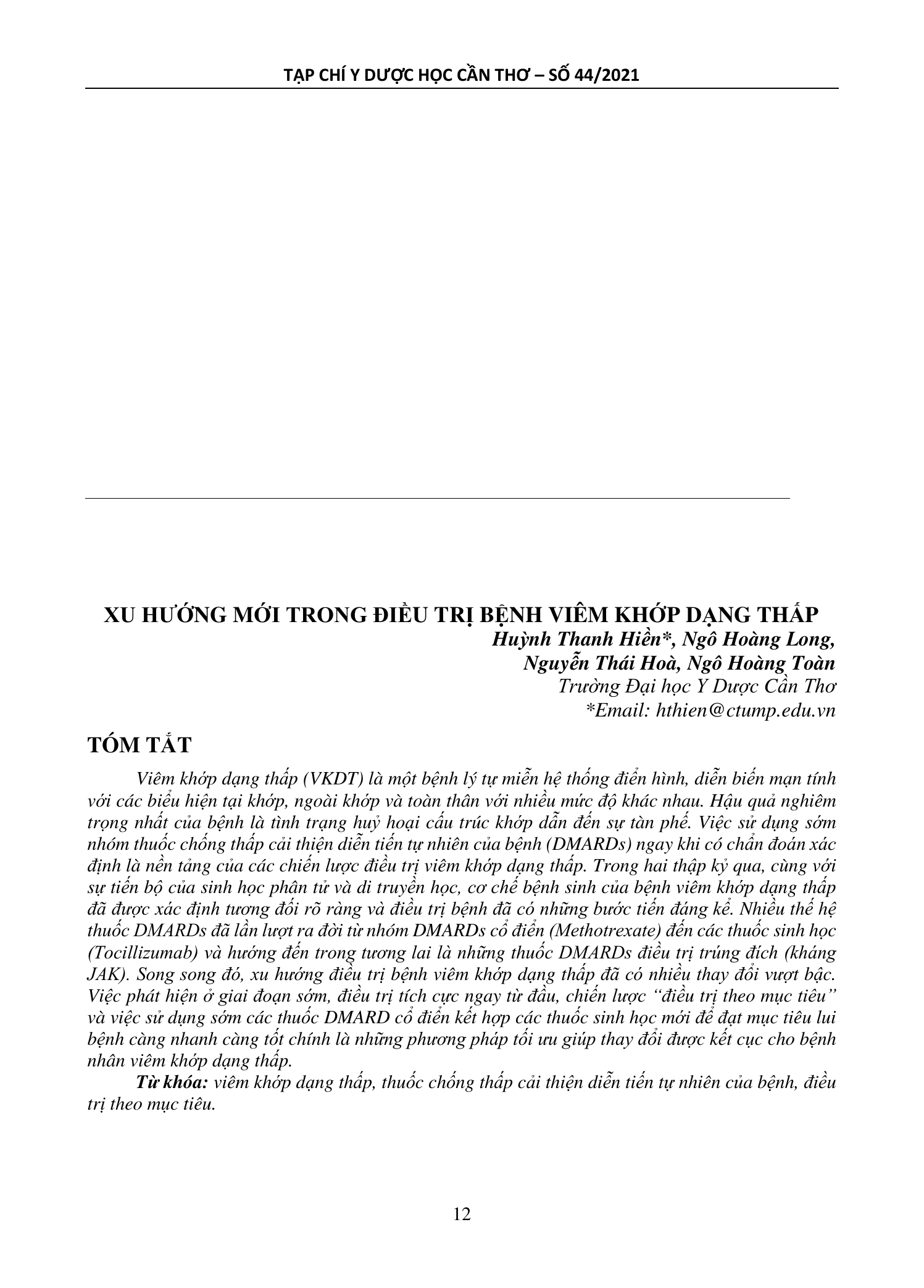 Viêm khớp dạng thấp (VKDT) là một bệnh lý tự miễn hệ thống điển hình, diễn biến mạn tính với các biểu hiện tại khớp, ngoài khớp và toàn thân với nhiều mức độ khác nhau. Hậu quả nghiêm trọng nhất của bệnh là tình trạng huỷ hoại cấu trúc khớp dẫn đến sự tàn phế. Việc sử dụng sớm nhóm thuốc chống thấp cải thiện diễn tiến tự nhiên của bệnh (DMARDs) ngay khi có chẩn đoán xác định là nền tảng của các chiến lược điều trị viêm khớp dạng thấp. Trong hai thập kỷ qua, cùng với sự tiến bộ của sinh học phân tử và di truyền học, cơ chế bệnh sinh của bệnh viêm khớp dạng thấp đã được xác định tương đối rõ ràng và điều trị bệnh đã có những bước tiến đáng kể. Nhiều thế hệ thuốc DMARDs đã lần lượt ra đời từ nhóm DMARDs cổ điển (Methotrexate) đến các thuốc sinh học (Tocillizumab) và hướng đến trong tương lai là những thuốc DMARDs điều trị trúng đích (kháng JAK). Song song đó, xu hướng điều trị bệnh viêm khớp dạng thấp đã có nhiều thay đổi vượt bậc. Việc phát hiện ở giai đoạn sớm, điều trị tích cực ngay từ đầu, chiến lược “điều trị theo mục tiêu” và việc sử dụng sớm các thuốc DMARD cổ điển kết hợp các thuốc sinh học mới để đạt mục tiêu lui bệnh càng nhanh càng tốt chính là những phương pháp tối ưu giúp thay đổi được kết cục cho bệnh nhân viêm khớp dạng thấp.