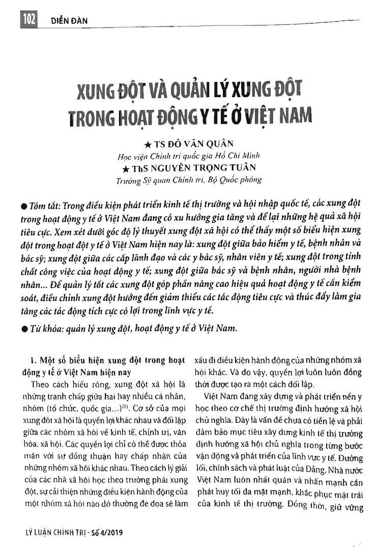 Trong điều kiện phát triển kinh tế thị trường và hội nhập quốc tế, các xung đột trong hoạt động y tế ở Việt Nam đang có xu hướng gia tăng và để lại những hệ quả xã hội tiêu cực. Xem xét dưới góc độ lý thuyết xung đột xã hội có thể thấy một số biểu hiện xung đột trong hoạt đột y tế ở Việt Nam hiện nay là xung đột giữa bảo hiểm y tế, bệnh nhân và bác sỹ; xung đột giữa các cấp lãnh đạo và các y bác sỹ, nhân viên y tế; xung đột trong tính chất công việc của hoạt động y tế; xung đột giữa bác sỹ và bệnh nhân, người nhà bệnh nhân... Để quản lý tốt các xung đột góp phần nâng cao hiệu quả hoạt động y tế cần kiểm soát, điều chỉnh xung đột hướng đến giảm thiểu các tác động tiêu cực và thúc đẩy làm gia tăng các tác động tích cực có lợi trong lĩnh vực y tế.