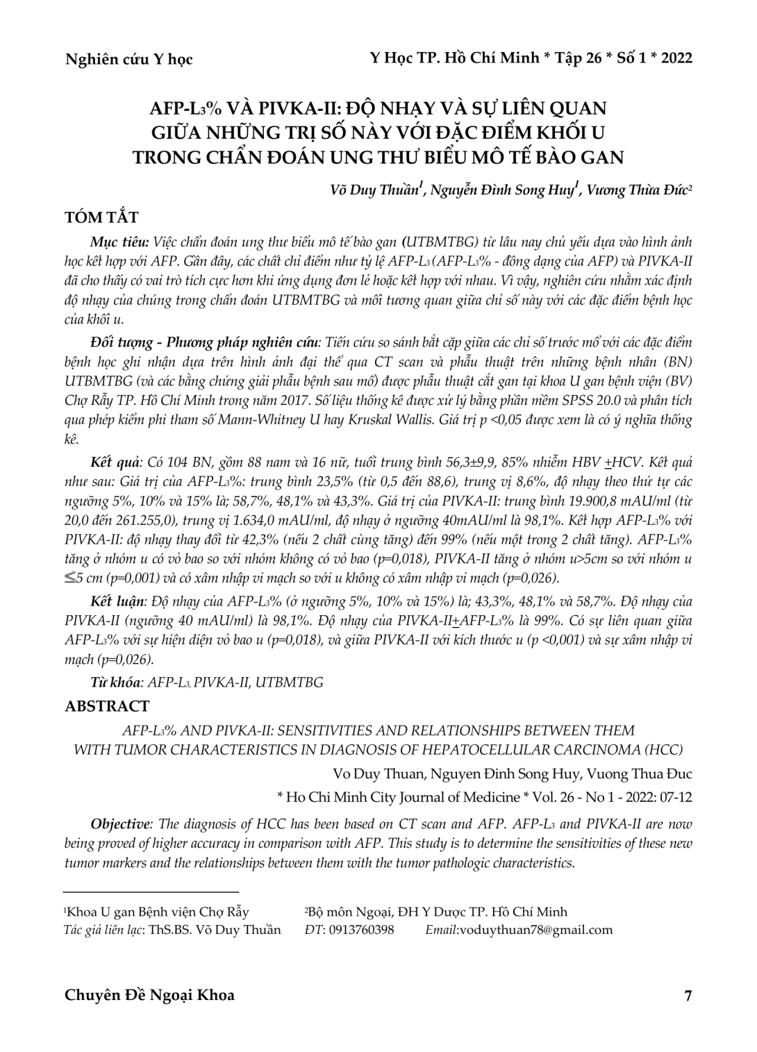 Việc chẩn đoán ung thư biểu mô tế bào gan (UTBMTBG) từ lâu nay chủ yếu dựa vào hình ảnh học kết hợp với AFP. Gần đây, các chất chỉ điểm như tỷ lệ AFP-L3 (AFP-L3% - đồng dạng của AFP) và PIVKA-II đã cho thấy có vai trò tích cực hơn khi ứng dụng đơn lẻ hoặc kết hợp với nhau. Vì vậy, nghiên cứu nhằm xác định độ nhạy của chúng trong chẩn đoán UTBMTBG và mối tương quan giữa chỉ số này với các đặc điểm bệnh học của khối u. Đối tượng - Phương pháp nghiên cứu: Tiến cứu so sánh bắt cặp giữa các chỉ số trước mổ với các đặc điểm bệnh học ghi nhận dựa trên hình ảnh đại thể qua CT scan và phẫu thuật trên những bệnh nhân (BN) UTBMTBG (và các bằng chứng giải phẫu bệnh sau mổ) được phẫu thuật cắt gan tại khoa U gan bệnh viện (BV) Chợ Rẫy TP. Hồ Chí Minh trong năm 2017. Số liệu thống kê được xử lý bằng phần mềm SPSS 20.0 và phân tích qua phép kiểm phi tham số Mann-Whitney U hay Kruskal Wallis. Giá trị p <0,05 được xem là có ý nghĩa thống kê. Kết quả: Có 104 BN, gồm 88 nam và 16 nữ, tuổi trung bình 56,3±9,9, 85% nhiễm HBV +HCV. Kết quả như sau: Giá trị của AFP-L3%: trung bình 23,5% (từ 0,5 đến 88,6), trung vị 8,6%, độ nhạy theo thứ tự các ngưỡng 5%, 10% và 15% là; 58,7%, 48,1% và 43,3%. Giá trị của PIVKA-II: trung bình 19.900,8 mAU/ml (từ 20,0 đến 261.255,0), trung vị 1.634,0 mAU/ml, độ nhạy ở ngưỡng 40mAU/ml là 98,1%. Kết hợp AFP-L3% với PIVKA-II: độ nhạy thay đổi từ 42,3% (nếu 2 chất cùng tăng) đến 99% (nếu một trong 2 chất tăng). AFP-L3% tăng ở nhóm u có vỏ bao so với nhóm không có vỏ bao (p=0,018), PIVKA-II tăng ở nhóm u>5cm so với nhóm u 5 cm (p=0,001) và có xâm nhập vi mạch so với u không có xâm nhập vi mạch (p=0,026).