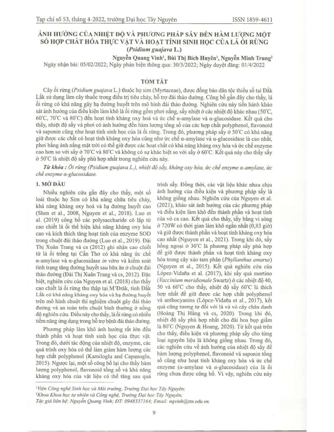 Cây ổi rừng (Psidium guajava L.) thuộc họ sim (Myrtaceae), được đồng bào dân tộc thiểu số tại Đắk Lắk sử dụng làm cây thuốc trong điều trị tiêu chảy, hỗ trợ đái tháo đường. Công bố gần đây cho thấy, lá ổi rừng có khả năng gây hạ đường huyết trên mô hình đái tháo đường. Nghiên cứu này tiến hành khảo sát ảnh hưởng của điều kiện làm khô lá ổi rừng gồm phơi nắng, sấy nhiệt ở các nhiệt độ khác nhau (50°C, 60°C, 70°C và 80°C) đến hoạt tính kháng oxy hoá và ức chế α-amylase và α-glucosidase. Kết quả cho thấy, nhiệt độ sấy và phơi có ảnh hưởng đến hàm lượng tổng số của các hợp chất polyphenol, flavonoid và saponin cũng như hoạt tính sinh học của lá ổi rừng. Trong đó, phương pháp sấy ở 50°C có khả năng giữ được các chất có hoạt tính kháng oxy hóa cũng như ức chế α-amylase và α-glucosidase là cao nhất, phơi bằng ánh nắng mặt trời có thể giữ được các hoạt chất có khả năng kháng oxy hóa và ức chế enzyme cao hơn so với sấy ở 70°C và 80°C và không có sự khác biệt so với sấy ở 60°C. Kết quả này cho thấy sấy ở 50°C là nhiệt độ sấy phù hợp nhất trong nghiên cứu này.
