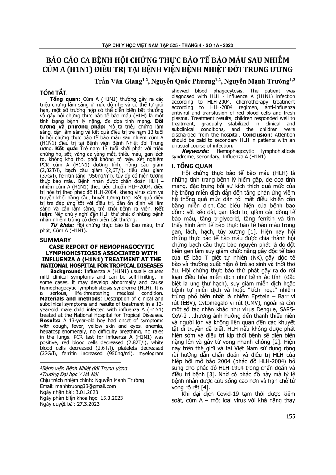 Cúm A (H1N1) thường gây ra các triệu chứng lâm sàng ở mức độ nhẹ và có thể tự giới hạn, một số trường hợp có thể diễn biến bất thường và gây hội chứng thực bào tế bào máu (HLH) là một tình trạng bệnh lý nặng, đe dọa tính mạng. Đối tượng và phương pháp: Mô tả triệu chứng lâm sàng, cận lâm sàng và kết quả điều trị trẻ nam 13 tuổi bị hội chứng thực bào tế bào máu sau nhiễm cúm A (H1N1) điều trị tại Bệnh viện Bệnh Nhiệt đới Trung ương. Kết quả: Trẻ nam 13 tuổi khởi phát với triệu chứng ho, sốt, vàng da vàng mắt, thiếu máu, gan lách to, không khó thở, phổi không có rale. Xét nghiệm PCR cúm A (H1N1) dương tính, hồng cầu giảm (2,82T/l), bạch cầu giảm (2,6T/l), tiểu cầu giảm (37G/l), ferritin tăng (950ng/ml), tủy đồ có hiện tượng thực bào máu. Bệnh nhân được chẩn đoán HLH – nhiễm cúm A (H1N1) theo tiêu chuẩn HLH-2004, điều trị hóa trị theo phác đồ HLH-2004, kháng virus cúm và truyền khối hồng cầu, huyết tương tươi. Kết quả điều trị trẻ đáp ứng tốt với điều trị, dần ổn định về lâm sàng và cận lâm sàng, trẻ khỏi bệnh ra viện. Kết luận: Nên chú ý nghĩ đến HLH thứ phát ở những bệnh nhân nhiễm trùng có diễn biến bất thường.