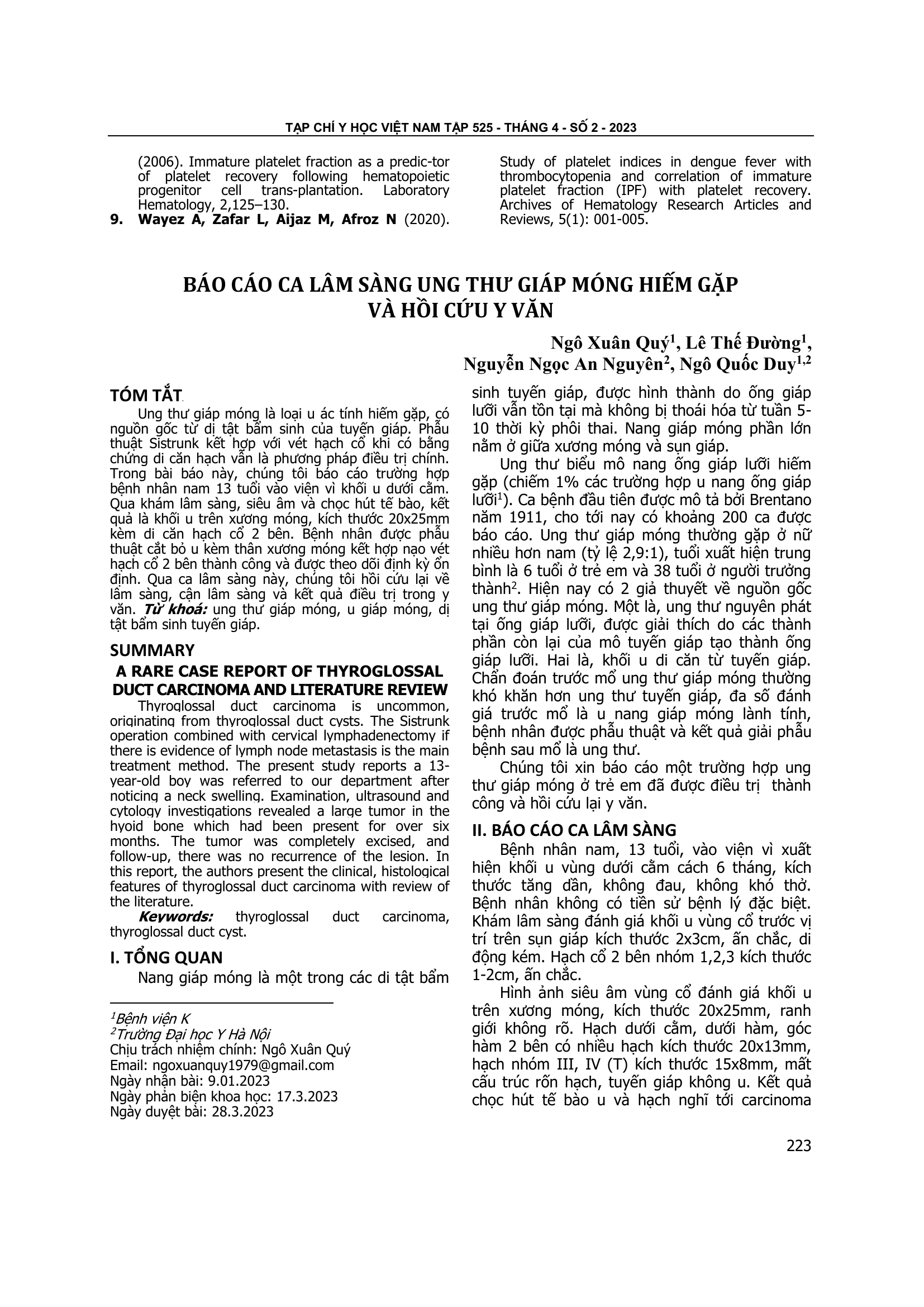 Ung thư giáp móng là loại u ác tính hiếm gặp, có nguồn gốc từ dị tật bẩm sinh của tuyến giáp. Phẫu thuật Sistrunk kết hợp với vét hạch cổ khi có bằng chứng di căn hạch vẫn là phương pháp điều trị chính. Trong bài báo này, chúng tôi báo cáo trường hợp bệnh nhân nam 13 tuổi vào viện vì khối u dưới cằm. Qua khám lâm sàng, siêu âm và chọc hút tế bào, kết quả là khối u trên xương móng, kích thước 20x25mm kèm di căn hạch cổ 2 bên. Bệnh nhân được phẫu thuật cắt bỏ u kèm thân xương móng kết hợp nạo vét hạch cổ 2 bên thành công và được theo dõi định kỳ ổn định. Qua ca lâm sàng này, chúng tôi hồi cứu lại về lâm sàng, cận lâm sàng và kết quả điều trị trong y văn.