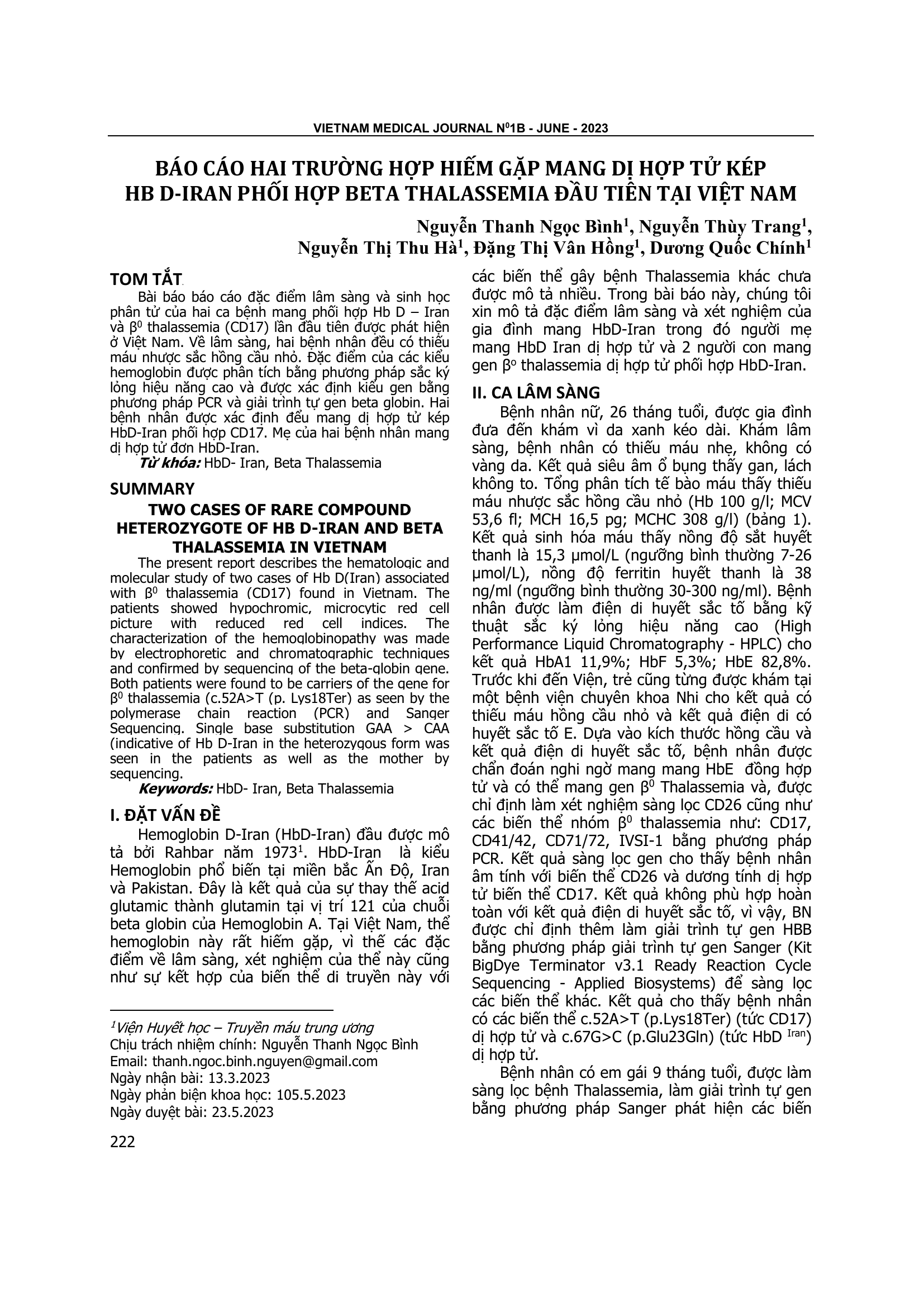 Báo cáo đặc điểm lâm sàng và sinh học phân tử của hai ca bệnh mang phối hợp Hb D – Iran và β0 thalassemia (CD17) lần đầu tiên được phát hiện ở Việt Nam. Về lâm sàng, hai bệnh nhân đều có thiếu máu nhược sắc hồng cầu nhỏ. Đặc điểm của các kiểu hemoglobin được phân tích bằng phương pháp sắc ký lỏng hiệu năng cao và được xác định kiểu gen bằng phương pháp PCR và giải trình tự gen beta globin. Hai bệnh nhân được xác định đểu mang dị hợp tử kép HbD-Iran phối hợp CD17. Mẹ của hai bệnh nhân mang dị hợp tử đơn HbD-Iran.