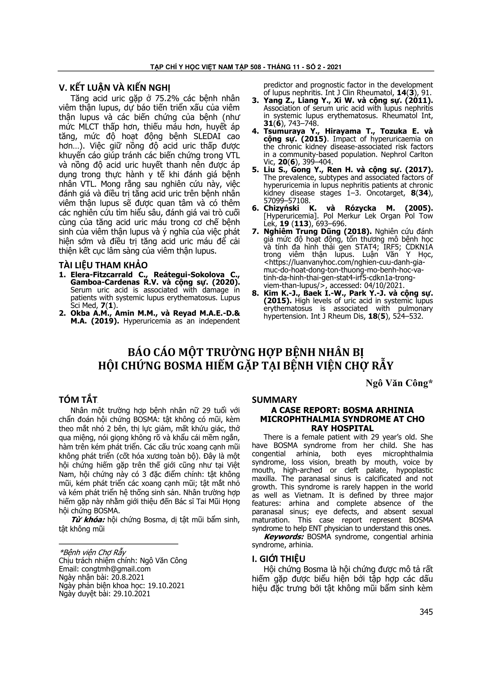 Nhân một trường hợp bệnh nhân nữ 29 tuổi với chẩn đoán hội chứng BOSMA: tật không có mũi, kèm theo mắt nhỏ 2 bên, thị lực giảm, mất khứu giác, thở qua miệng, nói giọng không rõ và khẩu cái mềm ngắn, hàm trên kém phát triển. Các cấu trúc xoang cạnh mũi không phát triển (cốt hóa xương toàn bộ). Đây là một hội chứng hiếm gặp trên thế giới cũng như tại Việt Nam, hội chứng này có 3 đặc điểm chính: tật không mũi, kém phát triển các xoang cạnh mũi; tật mắt nhỏ và kém phát triển hệ thống sinh sản. Nhân trường hợp hiếm gặp này nhằm giới thiệu đến Bác sĩ Tai Mũi Họng hội chứng BOSMA.