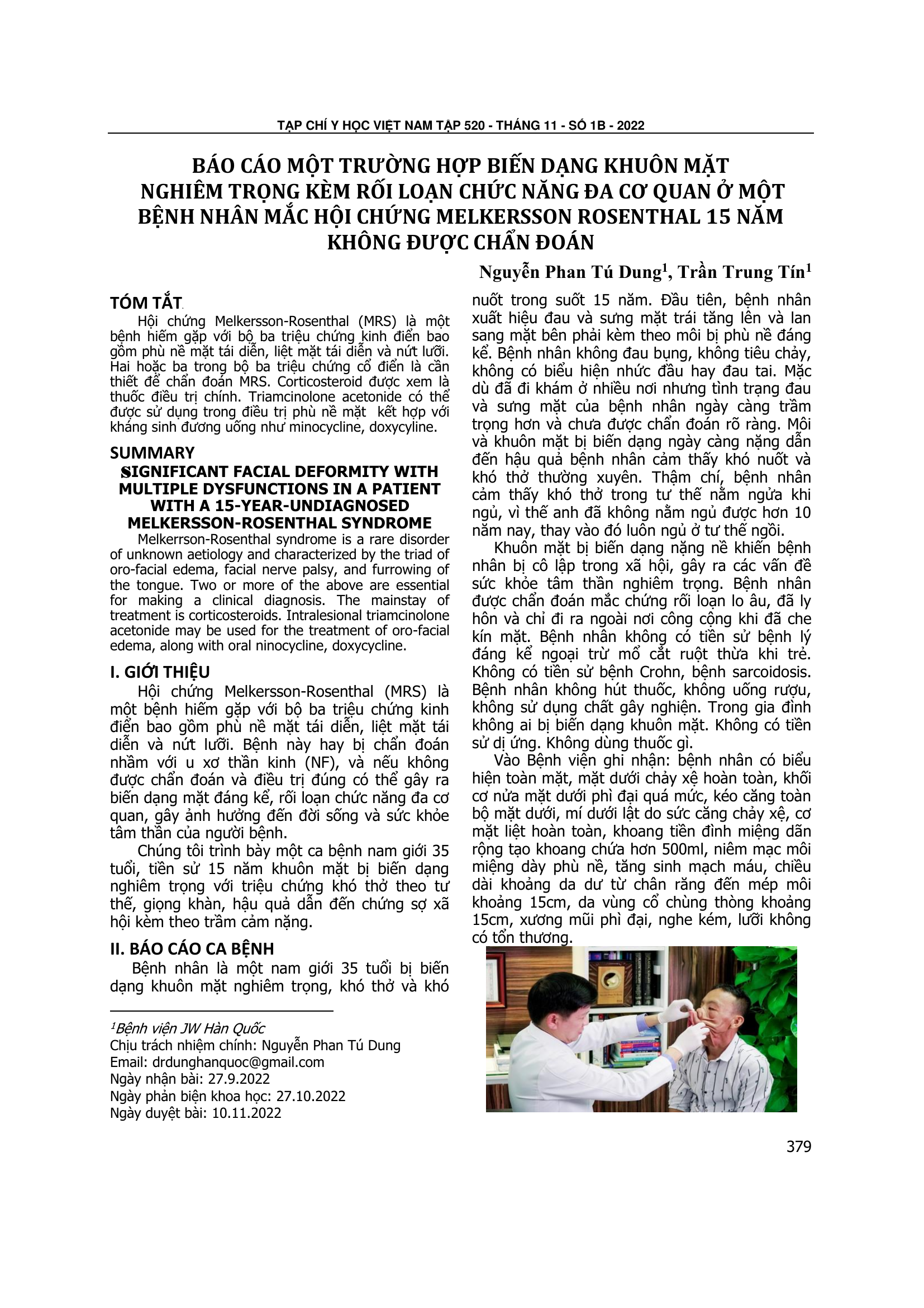 Hội chứng Melkersson-Rosenthal (MRS) là một bệnh hiếm gặp với bộ ba triệu chứng kinh điển bao gồm phù nề mặt tái diễn, liệt mặt tái diễn và nứt lưỡi. Hai hoặc ba trong bộ ba triệu chứng cổ điển là cần thiết để chẩn đoán MRS. Corticosteroid được xem là thuốc điều trị chính. Triamcinolone acetonide có thể được sử dụng trong điều trị phù nề mặt kết hợp với kháng sinh đương uống như minocycline, doxycyline.