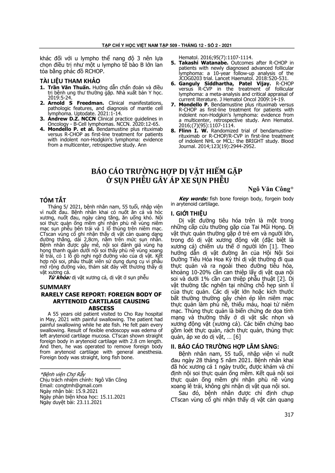 Tháng 5/ 2021, bệnh nhân nam, 55 tuổi, nhập viện vì nuốt đau. Bệnh nhân khai có nuốt ăn cá và hóc xương, nuốt đau, ngày càng tăng, ăn uống khó. Nội soi thực quản ống mềm ghi nhận phù nề vùng niêm mạc sụn phễu bên trái và 1 lổ thủng trên niêm mạc. CTscan vùng cổ ghi nhận thấy dị vật cản quang dạng đường thẳng, dài 2,8cm, nằm trên mức sụn nhẫn. Bệnh nhân được gây mê, nội soi đánh giá vùng hạ họng thanh quản dưới nội soi thấy phù nề vùng xoang lê trái, có 1 lỗ dò nghi ngờ đường vào của dị vật. Kết hợp nội soi, phẫu thuật viên sử dụng dụng cụ vi phẫu mở rộng đường vào, thám sát đáy vết thương thấy dị vật xương cá.