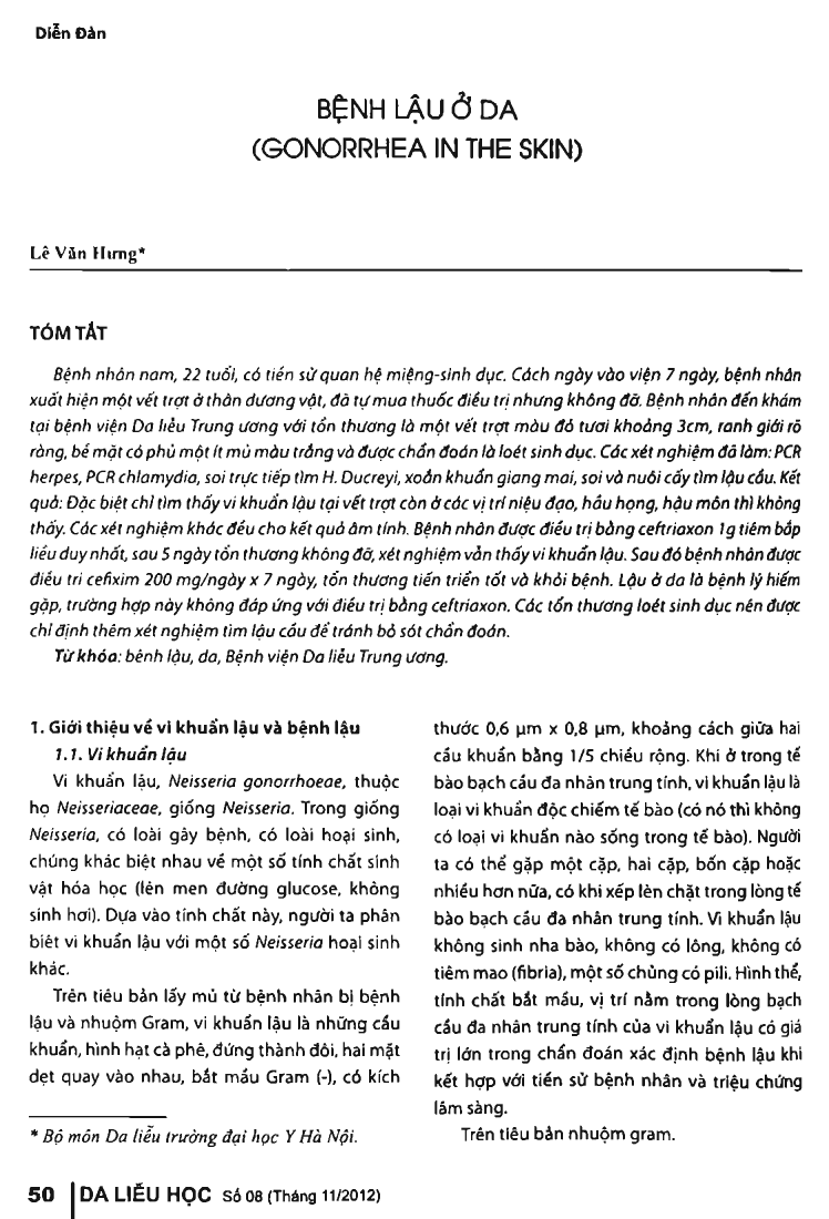 A patient, 22-year-old man, with a history of oral-genital sexual contacts had a peeled-off lesion on the body of the penis 7 days before hospital examination. He's been self-treated but no improvement has been seen. Patient visited at the National Hospital for Dermatology and Venereology with the injury of the 3-cm scarlet peeled-off lesion, clear boundaries. The lesion surface was covered with a little white pus and he was diagnosed of genital ulcers. He was tested for herpes PCR, chlamydia PCR, direct microscopy for H. ducreyi, T. pallidum, and culture for gonorrhea. Results: N. gonorrhoeae has been seen in the penis lesion and not in the urethra, throat, anus. Other tests were negative. Patient has been treated with Ceftriaxone 1 g-single intramuscular dose for 5 days but there was no change in the lesion, N. gonorrhoeae was still seen. Then patient was treated with cefixime at 200 mg/day for 7 days. Lesion progressed well and cured. Gonorrhea in the skin is rare. This case did not respond to the treatment of ceftriaxone. Genital ulcer lesions should be assigned additional tests for gonorrhea in order to avoid missing the diagnosis.