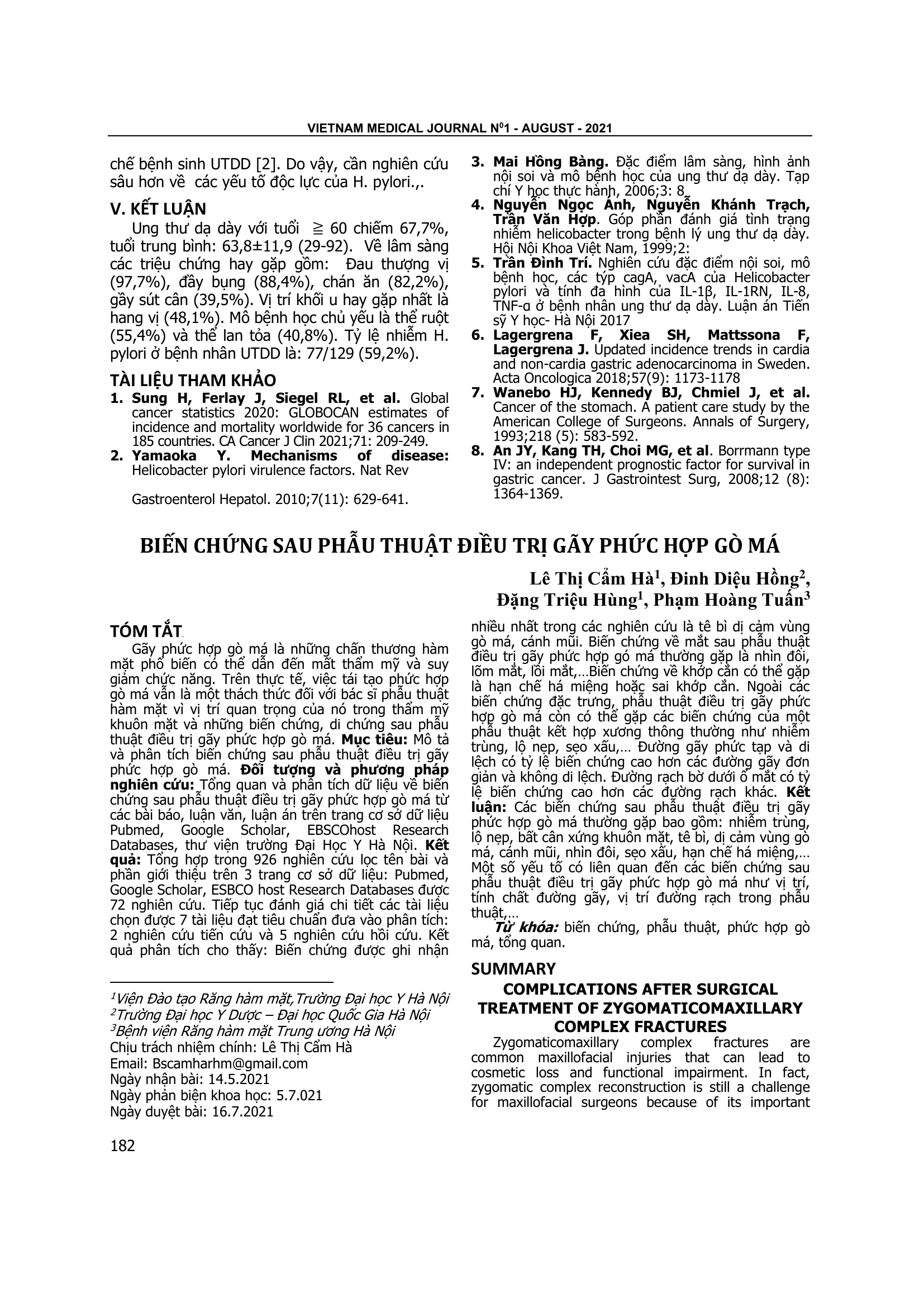 Mô tả và phân tích biến chứng sau phẫu thuật điều trị gãy phức hợp gò má. Đối tượng và phương pháp nghiên cứu: Tổng quan và phân tích dữ liệu về biến chứng sau phẫu thuật điều trị gãy phức hợp gò má từ các bài báo, luận văn, luận án trên trang cơ sở dữ liệu Pubmed, Google Scholar, EBSCOhost Research Databases, thư viện trường Đại Học Y Hà Nội. Kết quả: Tổng hợp trong 926 nghiên cứu lọc tên bài và phần giới thiệu trên 3 trang cơ sở dữ liệu: Pubmed, Google Scholar, ESBCO host Research Databases được 72 nghiên cứu. Tiếp tục đánh giá chi tiết các tài liệu chọn được 7 tài liệu đạt tiêu chuẩn đưa vào phân tích: 2 nghiên cứu tiến cứu và 5 nghiên cứu hồi cứu. Kết quả phân tích cho thấy: Biến chứng được ghi nhận nhiều nhất trong các nghiên cứu là tê bì dị cảm vùng gò má, cánh mũi. Biến chứng về mắt sau phẫu thuật điều trị gãy phức hợp gó má thường gặp là nhìn đôi, lõm mắt, lồi mắt,…Biến chứng về khớp cắn có thể gặp là hạn chế há miệng hoặc sai khớp cắn. Ngoài các biến chứng đặc trưng, phẫu thuật điều trị gãy phức hợp gò má còn có thể gặp các biến chứng của một phẫu thuật kết hợp xương thông thường như nhiễm trùng, lộ nẹp, sẹo xấu,… Đường gãy phức tạp và di lệch có tỷ lệ biến chứng cao hơn các đường gãy đơn giản và không di lệch. Đường rạch bờ dưới ổ mắt có tỷ lệ biến chứng cao hơn các đường rạch khác.