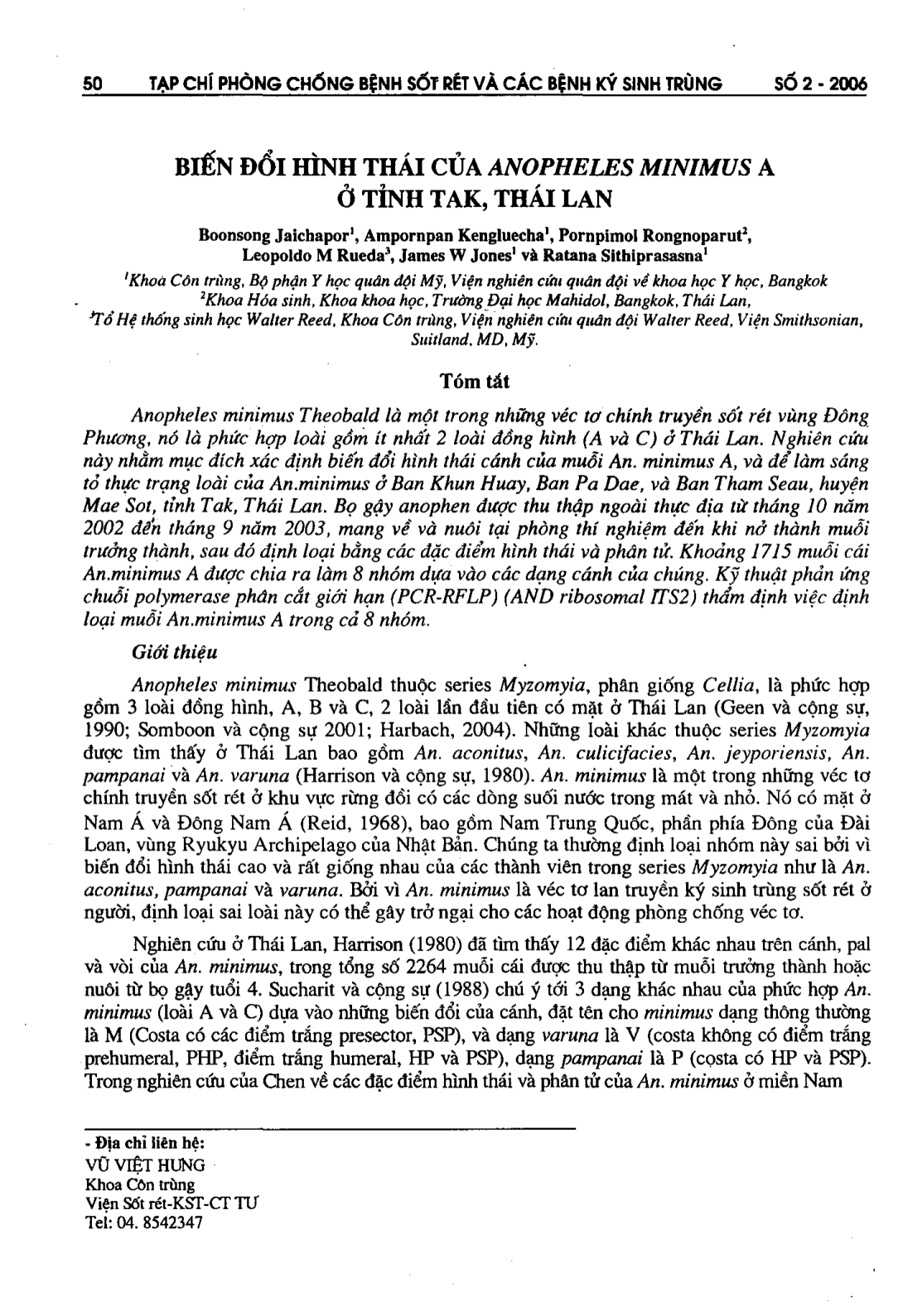 Anopheles Minimus Theobald là một trong những vect[ chính truyền sốt rét ở phương Đông. Nó có 2 loài đồng hình (A và C) ở Thái Lan. Nghiên cứu này xác định sự biến đổi hình thái của muỗi An Minimus A và đánh giá thực trạng loài muỗi này ở một số địa phương tại Thái Lan. Kết quả NC cho thấy, có khoảng 1715 muooix cái An Minimus A, chia thành 8 nhóm dựa vào dạng cánh của chúng. Các nhà nghiên cứu đã sử dụng phản ứng chuỗi polymese để phân cắt giới hạn thẩm định loài muỗi An Minimus A trong số 8 loài muỗi.