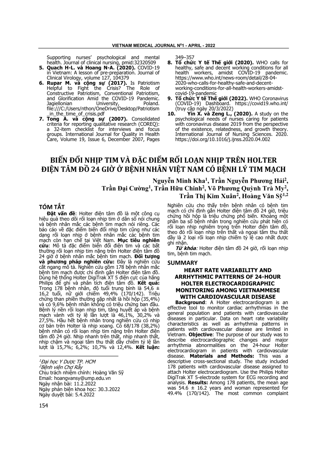 Mô tả đặc điểm biến đổi điện tim và các bất thường rối loạn nhịp tim nặng trên Holter điện tâm đồ 24 giờ ở bệnh nhân mắc bệnh tim mạch. Đối tượng và phương pháp nghiên cứu: Đây là nghiên cứu cắt ngang mô tả. Nghiên cứu gồm 178 bệnh nhân mắc bệnh tim mạch được chỉ định gắn Holter điện tâm đồ. Dùng hệ thống Holter DigiTrak XT 5 điện cực của hãng Philips để ghi và phân tích điện tâm đồ. Kết quả: Trong 178 bệnh nhân, độ tuổi trung bình là 54,6 ± 16,2 tuổi, nữ giới chiếm 49,4% (170/142). Triệu chứng than phiền thường gặp nhất là hồi hộp (35,4%) và có 9,6% bệnh nhân không có triệu chứng ban đầu. Bệnh lý nền rối loạn nhịp tim, tăng huyết áp và bệnh mạch vành với tỷ lệ lần lượt là 46,1%, 30,2% và 27,5%. Hầu hết bệnh nhân trong nghiên cứu có nhịp cơ bản trên Holter là nhịp xoang. Có 68/178 (38,2%) bệnh nhân có rối loạn nhịp tim nặng trên Holter điện tâm đồ 24 giờ. Nhịp nhanh trên thất, nhịp nhanh thất, nhịp chậm và ngoại tâm thu thất dầy chiếm tỷ lệ lần lượt là 15,7%; 6,2%; 10,7% và 12,4%. Kết luận: Nghiên cứu cho thấy trên bệnh nhân có bệnh tim mạch có chỉ định gắn Holter điện tâm đồ 24 giờ, triệu chứng hồi hộp là triệu chứng phổ biến. Khoảng một phần ba số bệnh nhân trong nghiên cứu phát hiện có rối loạn nhịp nghiêm trọng trên Holter điện tâm đồ, theo đó rối loạn nhịp trên thất và ngoại tâm thu thất dầy là 2 loại rối loạn nhịp chiếm tỷ lệ cao nhất được ghi nhận.