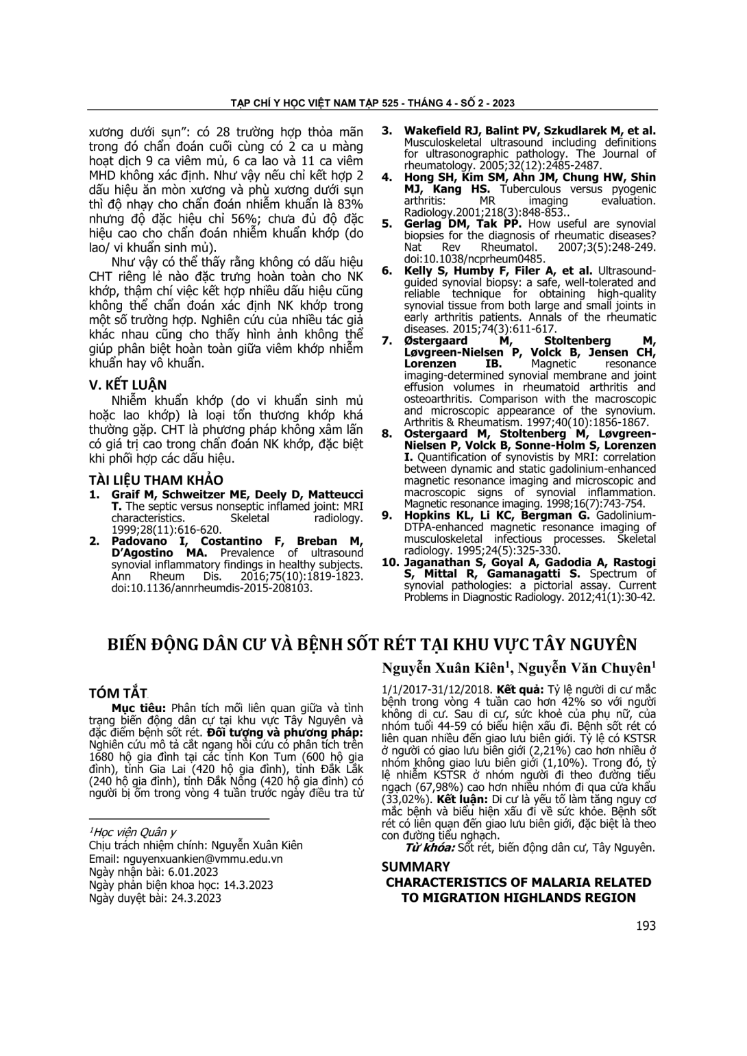 Phân tích mối liên quan giữa và tình trạng biến động dân cự tại khu vực Tây Nguyên và đặc điểm bệnh sốt rét. Đối tượng và phương pháp: Nghiên cứu mô tả cắt ngang hồi cứu có phân tích trên 1680 hộ gia đình tại các tỉnh Kon Tum (600 hộ gia đình), tỉnh Gia Lai (420 hộ gia đình), tỉnh Đắk Lắk (240 hộ gia đình), tỉnh Đắk Nông (420 hộ gia đình) có người bị ốm trong vòng 4 tuần trước ngày điều tra từ 1/1/2017-31/12/2018. Kết quả: Tỷ lệ người di cư mắc bệnh trong vòng 4 tuần cao hơn 42% so với người không di cư. Sau di cư, sức khoẻ của phụ nữ, của nhóm tuổi 44-59 có biểu hiện xấu đi. Bệnh sốt rét có liên quan nhiều đến giao lưu biên giới. Tỷ lệ có KSTSR ở người có giao lưu biên giới (2,21%) cao hơn nhiều ở nhóm không giao lưu biên giới (1,10%). Trong đó, tỷ lệ nhiễm KSTSR ở nhóm người đi theo đường tiểu ngạch (67,98%) cao hơn nhiều nhóm đi qua cửa khẩu (33,02%). Kết luận: Di cư là yếu tố làm tăng nguy cơ mắc bệnh và biểu hiện xấu đi về sức khỏe. Bệnh sốt rét có liên quan đến giao lưu biên giới, đặc biệt là theo con đường tiểu nghạch.