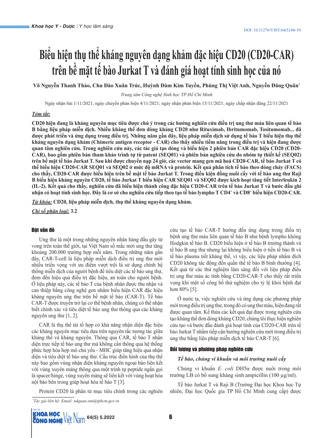 CD20 hiện đang là kháng nguyên mục tiêu được chú ý trong các hướng nghiên cứu điều trị ung thư máu liên quan tế bào B bằng liệu pháp miễn dịch. Nhiều kháng thể đơn dòng kháng CD20 như Rituximab, Ibritumomab, Tositumomab... đã được phát triển và ứng dụng trong điều trị. Những năm gần đây, liệu pháp miễn dịch sử dụng tế bào T biểu hiện thụ thể kháng nguyên dạng khảm (Chimeric antigen receptor - CAR) cho thấy nhiều tiềm năng trong điều trị và hiện đang được quan tâm nghiên cứu. Trong nghiên cứu này, các tác giả tạo dòng và biểu hiện 2 phiên bản CAR đặc hiệu CD20 (CD20- CAR), bao gồm phiên bản tham khảo trình tự từ patent (SEQ01) và phiên bản nghiên cứu do nhóm tự thiết kế (SEQ02) trên bề mặt tế bào Jurkat T. Sau khi được chuyển nạp 24 giờ, các vector mang gen mã hoá CD20-CAR, tế bào Jurkat T có thể biểu hiện CD20-CAR SEQ01 và SEQ02 ở mức độ mRNA và protein. Kết quả phân tích tế bào theo dòng chảy (FACS) cho thấy, CD20-CAR được biểu hiện trên bề mặt tế bào Jurkat T. Trong điều kiện đồng nuôi cấy với tế bào ung thư Raji B biểu hiện kháng nguyên CD20, tế bào Jurkat T biểu hiện CAR SEQ01 và SEQ02 được kích hoạt tăng tiết Interleukin 2 (IL-2). Kết quả cho thấy, nghiên cứu đã biểu hiện thành công đặc hiệu CD20-CAR trên tế bào Jurkat T và bước đầu ghi nhận có hoạt tính sinh học. Đây là cơ sở cho nghiên cứu tiếp theo tạo tế bào lympho T CD4+ và CD8+ biểu hiện CD20-CAR.