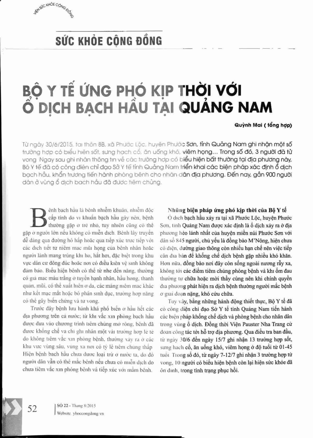 Bộ Y tế ứng phó kịp thời với ổ dịch bạch hầu tại Quảng Nam