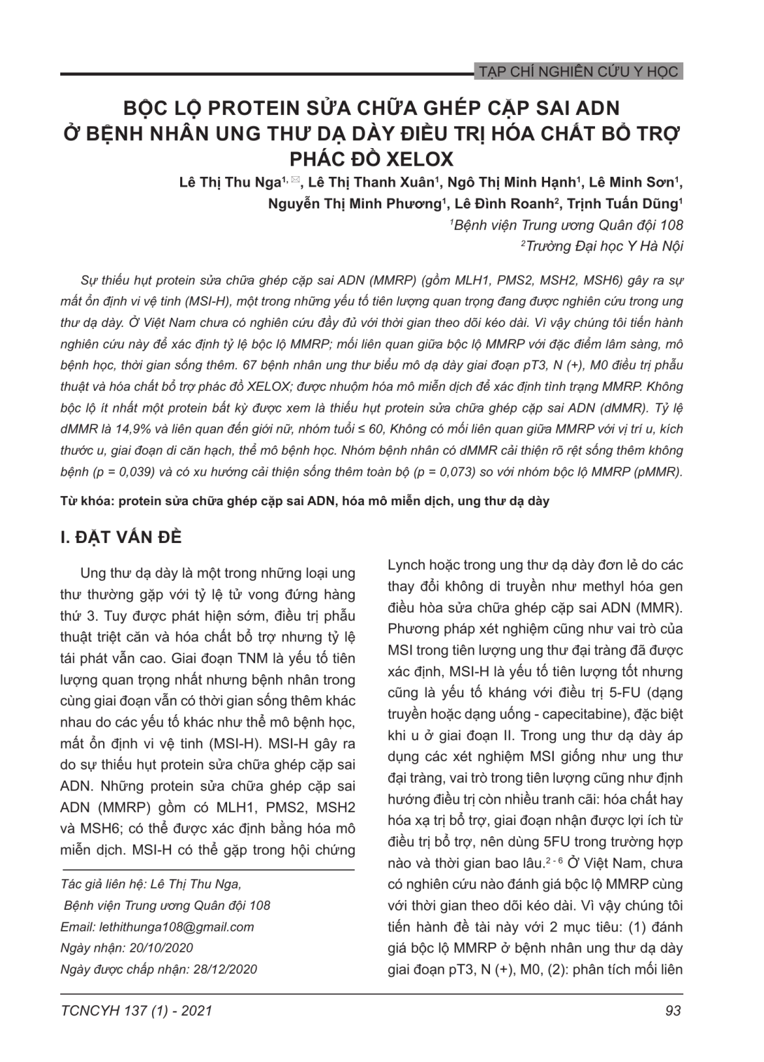 Sự thiếu hụt protein sửa chữa ghép cặp sai ADN (MMRP) (gồm MLH1, PMS2, MSH2, MSH6) gây ra sự mất ổn định vi vệ tinh (MSI-H), một trong những yếu tố tiên lượng quan trọng đang được nghiên cứu trong ung thư dạ dày. Ở Việt Nam chưa có nghiên cứu đầy đủ với thời gian theo dõi kéo dài. Vì vậy chúng tôi tiến hành nghiên cứu này để xác định tỷ lệ bộc lộ MMRP; mối liên quan giữa bộc lộ MMRP với đặc điểm lâm sàng, mô bệnh học, thời gian sống thêm. 67 bệnh nhân ung thư biểu mô dạ dày giai đoạn pT3, N (+), M0 điều trị phẫu thuật và hóa chất bổ trợ phác đồ XELOX; được nhuộm hóa mô miễn dịch để xác định tình trạng MMRP. Không bộc lộ ít nhất một protein bất kỳ được xem là thiếu hụt protein sửa chữa ghép cặp sai ADN (dMMR). Tỷ lệ dMMR là 14,9% và liên quan đến giới nữ, nhóm tuổi ≤ 60, Không có mối liên quan giữa MMRP với vị trí u, kích thước u, giai đoạn di căn hạch, thể mô bệnh học. Nhóm bệnh nhân có dMMR cải thiện rõ rệt sống thêm không bệnh (p = 0,039) và có xu hướng cải thiện sống thêm toàn bộ (p = 0,073) so với nhóm bộc lộ MMRP (pMMR).