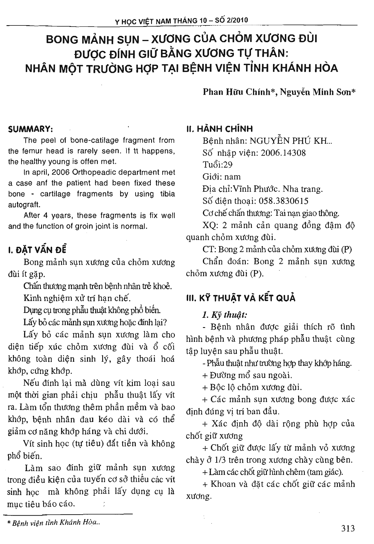 Bong mảnh sụn - xương của chỏm xương đùi được đính giữ bằng xương tự thân: Nhân một trường hợp tại bệnh viện tỉnh Khánh Hòa