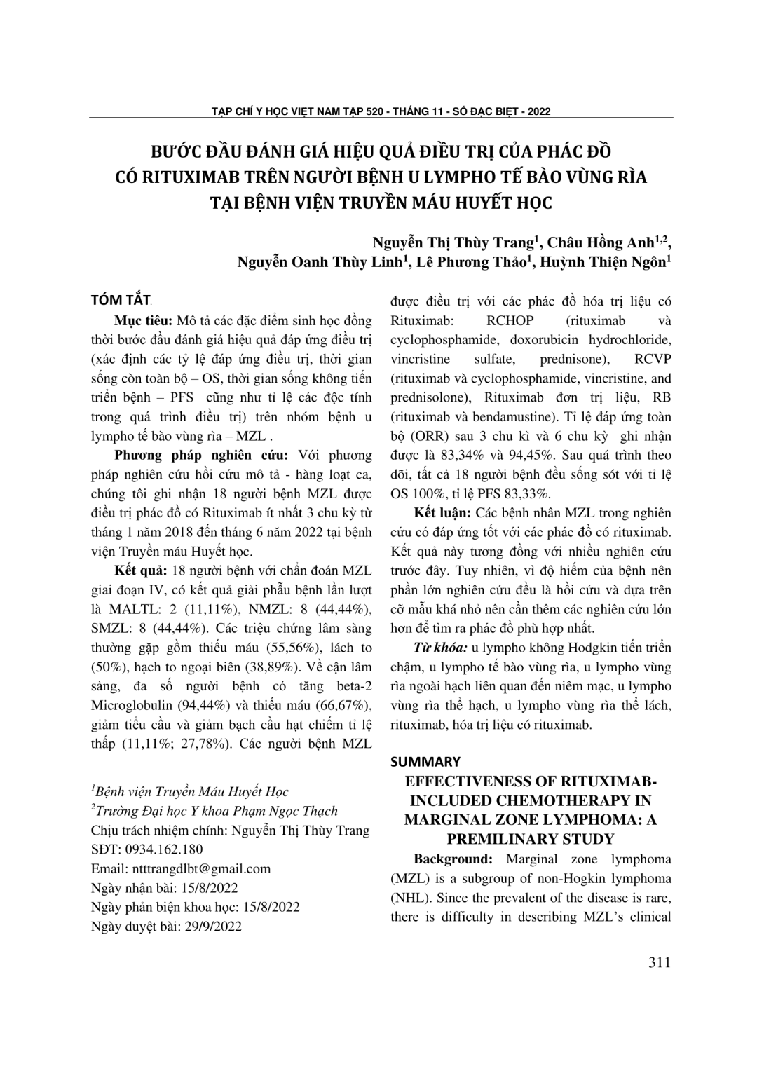 Mô tả các đặc điểm sinh học đồng thời bước đầu đánh giá hiệu quả đáp ứng điều trị (xác định các tỷ lệ đáp ứng điều trị, thời gian sống còn toàn bộ – OS, thời gian sống không tiến triển bệnh – PFS cũng như tỉ lệ các độc tính trong quá trình điều trị) trên nhóm bệnh u lympho tế bào vùng rìa – MZL . Phương pháp nghiên cứu: Với phương pháp nghiên cứu hồi cứu mô tả - hàng loạt ca, chúng tôi ghi nhận 18 người bệnh MZL được điều trị phác đồ có Rituximab ít nhất 3 chu kỳ từ tháng 1 năm 2018 đến tháng 6 năm 2022 tại bệnh viện Truyền máu Huyết học. Kết quả: 18 người bệnh với chẩn đoán MZL giai đoạn IV, có kết quả giải phẫu bệnh lần lượt là MALTL: 2 (11,11%), NMZL: 8 (44,44%), SMZL: 8 (44,44%). Các triệu chứng lâm sàng thường gặp gồm thiếu máu (55,56%), lách to (50%), hạch to ngoại biên (38,89%). Về cận lâm sàng, đa số người bệnh có tăng beta-2 Microglobulin (94,44%) và thiếu máu (66,67%), giảm tiểu cầu và giảm bạch cầu hạt chiếm tỉ lệ thấp (11,11%; 27,78%). Các người bệnh MZL được điều trị với các phác đồ hóa trị liệu có Rituximab: RCHOP (rituximab và cyclophosphamide, doxorubicin hydrochloride, vincristine sulfate, prednisone), RCVP (rituximab và cyclophosphamide, vincristine, and prednisolone), Rituximab đơn trị liệu, RB (rituximab và bendamustine). Tỉ lệ đáp ứng toàn bộ (ORR) sau 3 chu kì và 6 chu kỳ ghi nhận được là 83,34% và 94,45%. Sau quá trình theo dõi, tất cả 18 người bệnh đều sống sót với tỉ lệ OS 100%, tỉ lệ PFS 83,33%. Kết luận: Các bệnh nhân MZL trong nghiên cứu có đáp ứng tốt với các phác đồ có rituximab. Kết quả này tương đồng với nhiều nghiên cứu trước đây. Tuy nhiên, vì độ hiếm của bệnh nên phần lớn nghiên cứu đều là hồi cứu và dựa trên cỡ mẫu khá nhỏ nên cần thêm các nghiên cứu lớn hơn để tìm ra phác đồ phù hợp nhất.