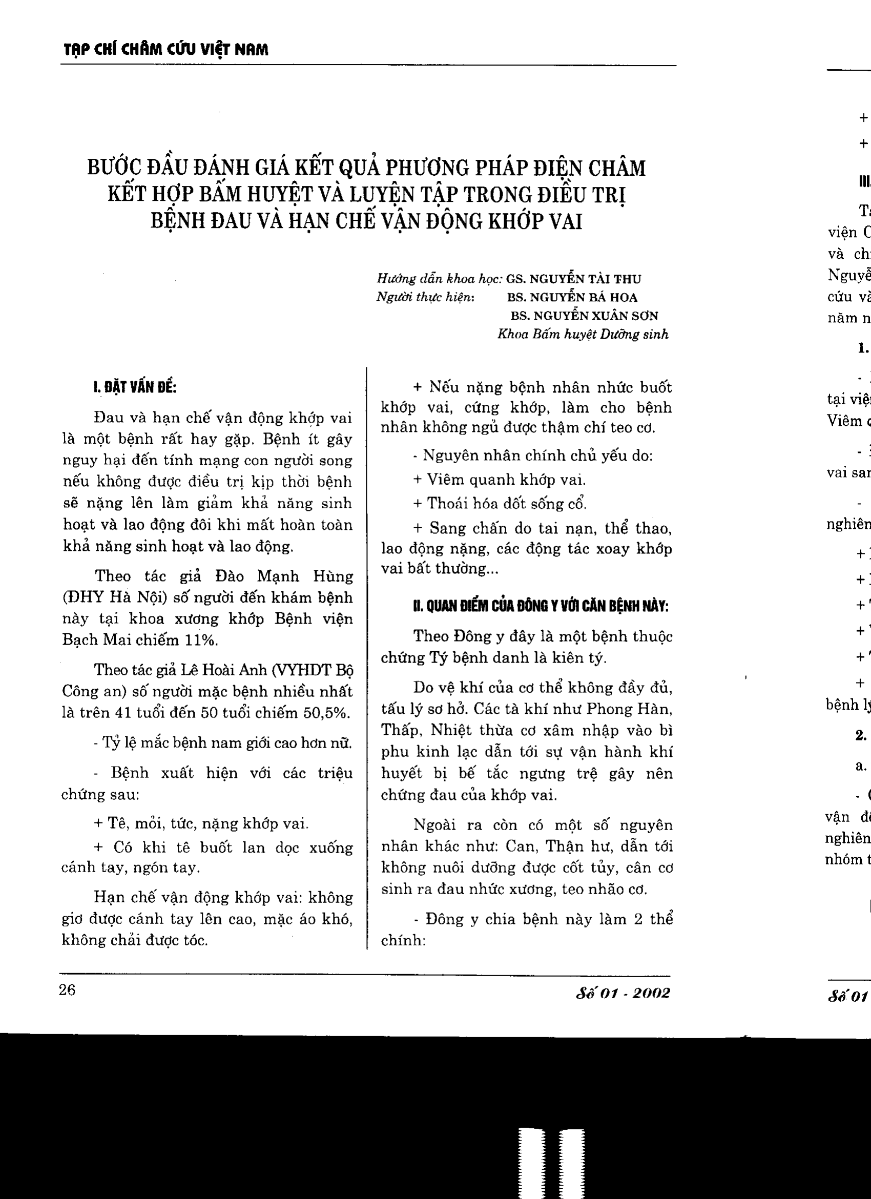 Bước đầu đánh giá kết quả phương pháp điện châm kết hợp bấm huyệt và luyện tập trong điều trị bệnh đau và hạn chế vận động khớp vai