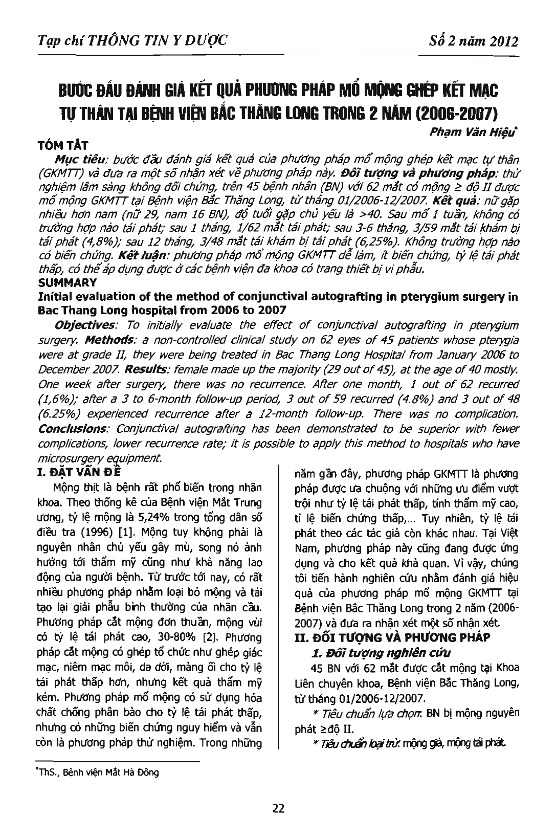 Bước đầu đánh giá kết quả phương pháp mổ mộng ghép kết mạc tự thân tại bệnh viện Bắc Thăng Long trong 2 năm (2006-2007)