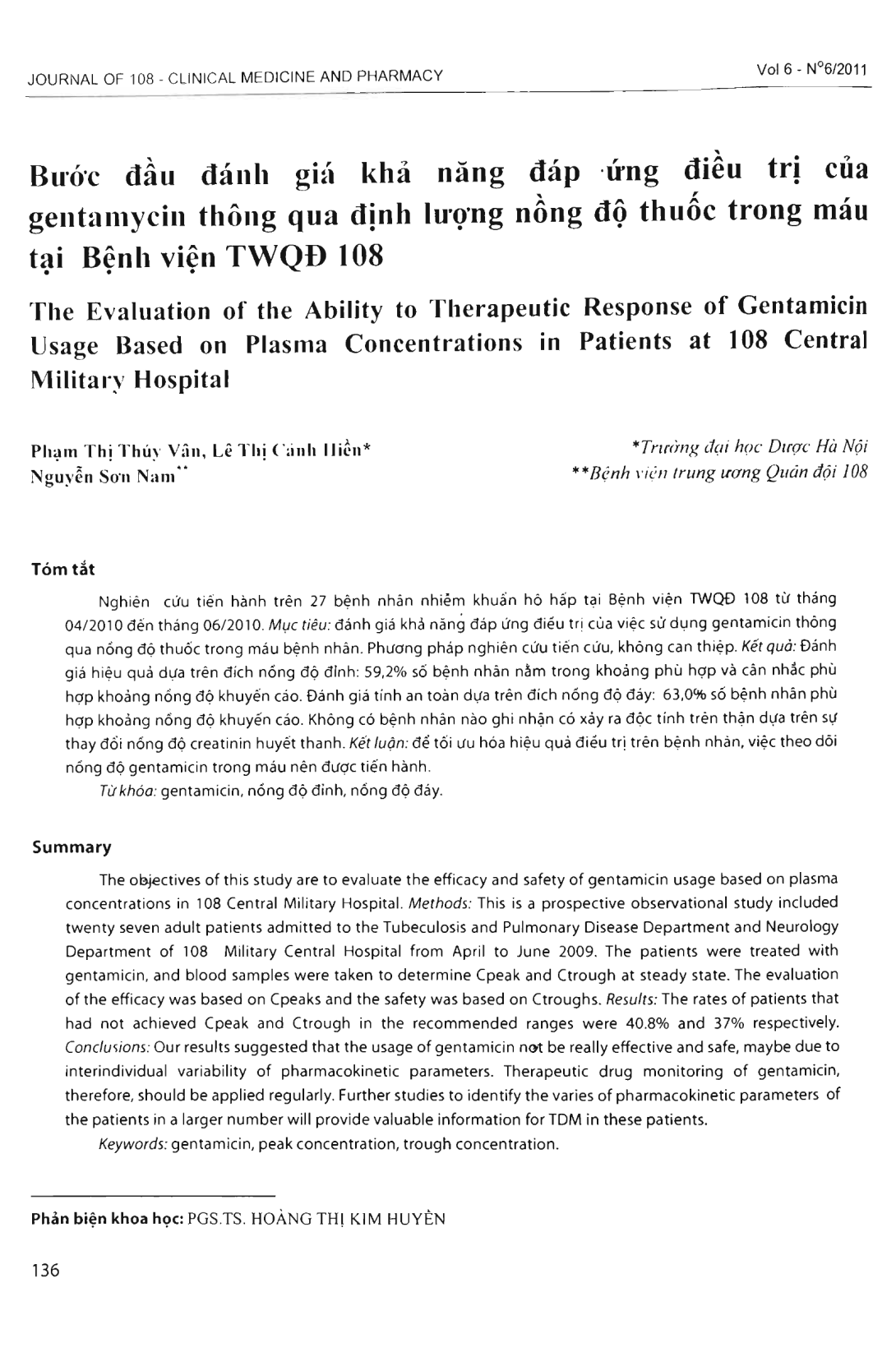 The objectives of this study are to evaluate the efficacy and safety of gentamicin usage based on plasma concentrations in No.108 Central Military Hospital. Methods: This is a prospective observational study included twenty seven adult patients admitted to the Tubeculosis and Pulmonary Disease Department and Neurology Department of No.108 Military Central Hospital from April to June 2009. The patients were treated with gentamicin, and blood samples were taken to determine Cpeak and Ctrough at steady state. The evaluation of the efficacy was based on Cpeaks and the safety was based on Ctroughs. Results: The rates of patients that had not achieved Cpeak and Ctrough in the recommended ranges were 40.8 percent and 37 percent respectively. Conclusions: The results suggested that the usage of gentamicin not be really effective and safe, maybe due to interindividual variability of pharmacokinetic parameters. Therapeutic drug monitoring of gentamicin, therefore, should be applied regularly. Further studies to identify the varies of pharmacokinetic parameters of the patients in a larger number will provide valuable information for TDM in these patients.
